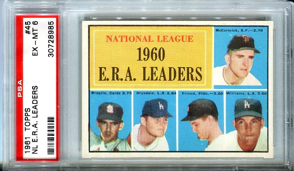 | Product Title | 1961 Topps Baseball #45 NL ERA Leaders PSA 6 Pitchers Baseball Card Don Drysdale Bob Friend |