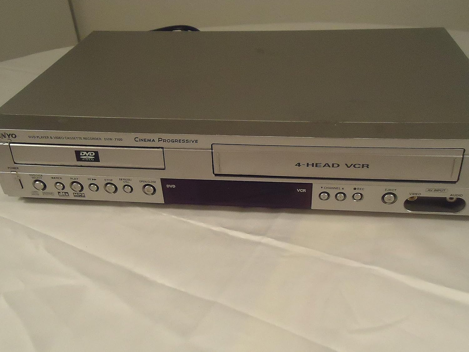 Image Description: Front view of the Sanyo DVW7100 DVD/VCR combo player. The left side features the DVD tray with 'DVD VIDEO' logo, and below it, buttons for POWER, DVD/VCR SELECT, REW, PLAY, FF, STOP, PAUSE/STILL, and OPEN/CLOSE. The right side shows the VCR slot labeled '4-HEAD VCR', with buttons for VCR functions including CHANNEL, REC, EJECT, and AV INPUT (Video and Audio jacks).