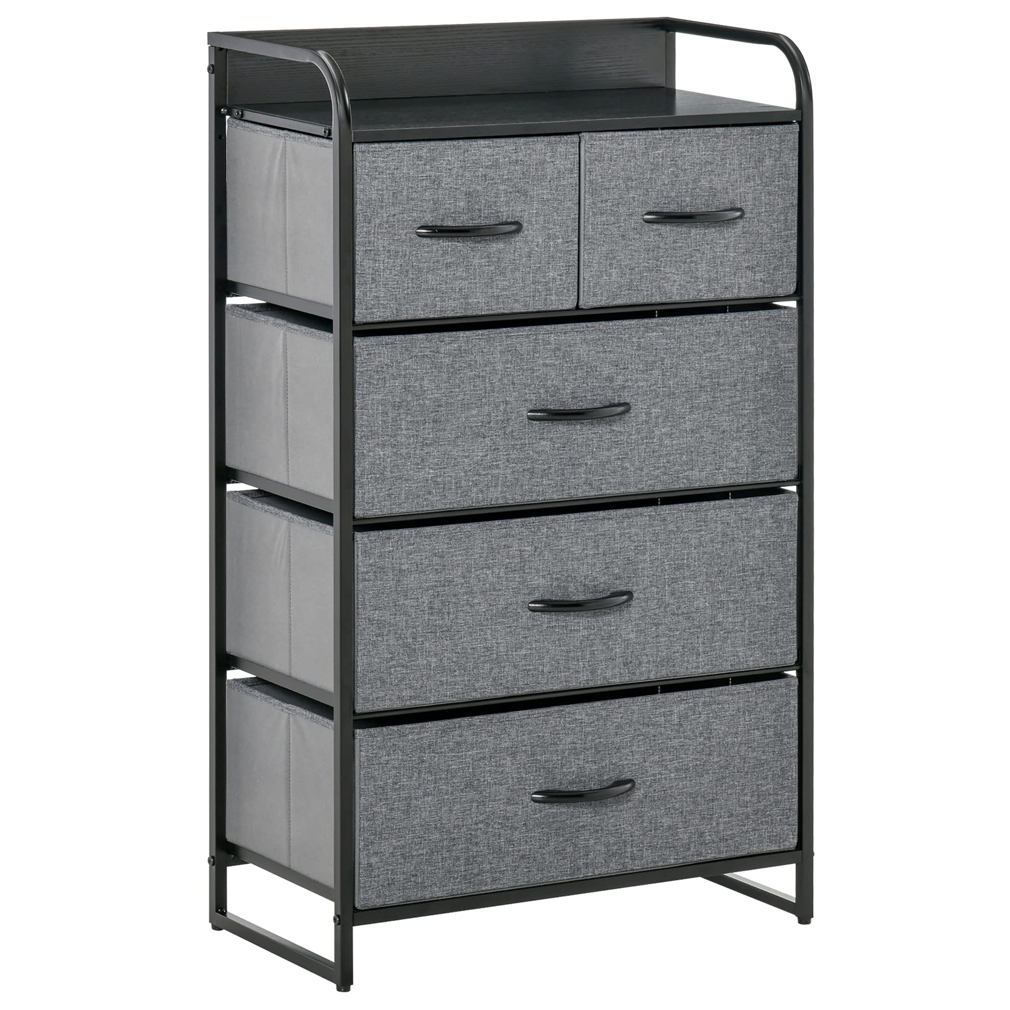 The HOMCOM 5-Drawer Fabric Dresser Tower is a versatile storage solution designed for organizing various household items. It features a durable steel frame, a sturdy MDF wooden top, and five fabric drawers. This unit is suitable for use in hallways, bedrooms, and closets, providing ample storage while maintaining a compact footprint.