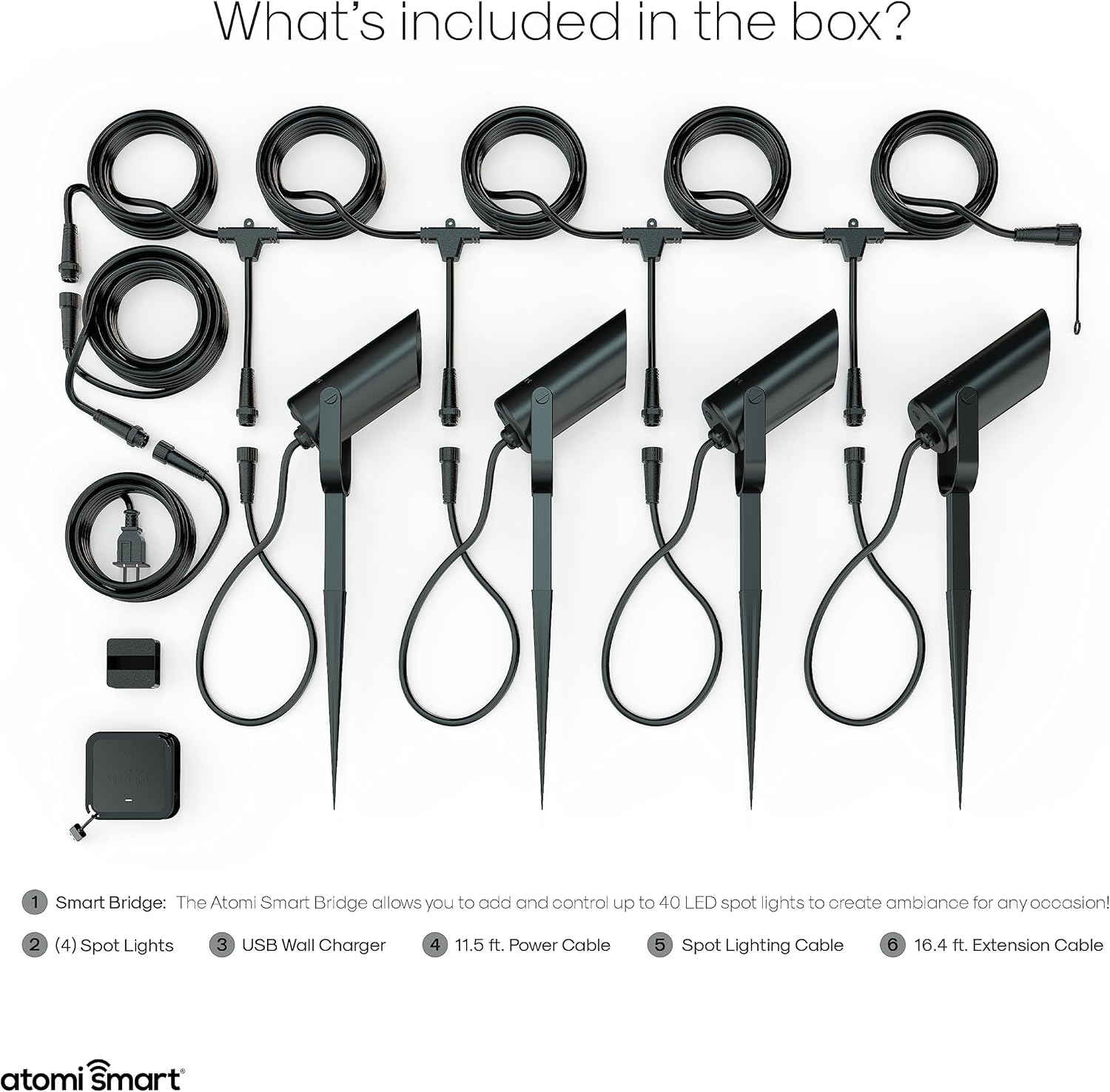 Thank you for choosing the Atomi Smart WiFi LED Spot Lights. This 4-pack starter kit is designed to enhance your outdoor living spaces with intelligent, customizable lighting. Featuring 400 lumens of bright, dimmable light, these IP65 waterproof spot lights offer over 16 million color options and tunable white light, all controllable via the Atomi Smart app or voice commands with Amazon Alexa and Google Assistant.