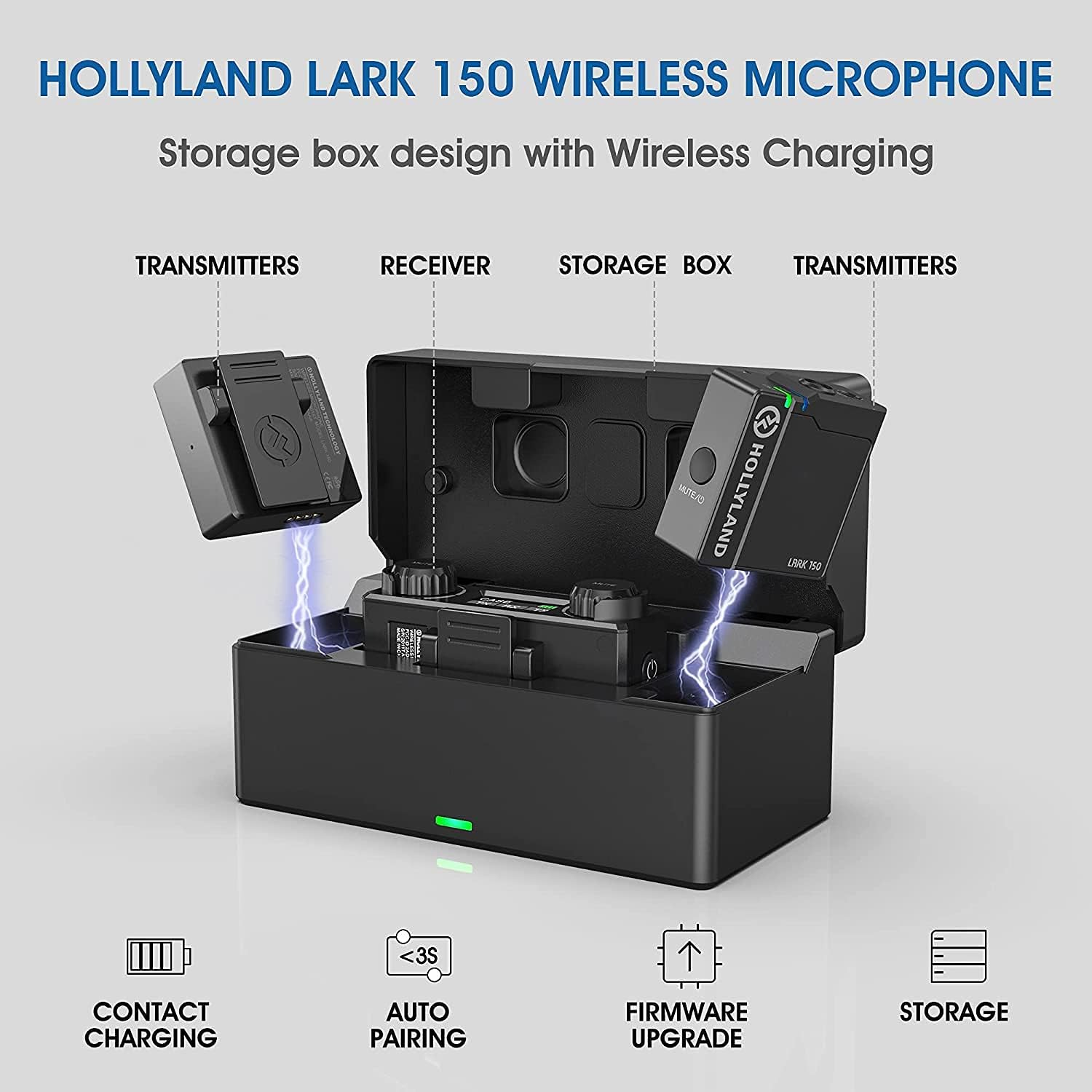 Image 1.1: Overview of the HollyView Hollyland Lark 150 Wireless Lavalier Microphone System, showing the transmitters, receiver, and charging case.