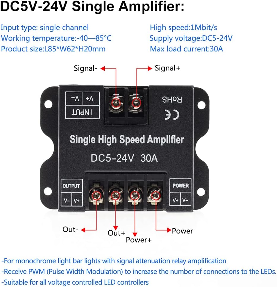- Do not exceed the maximum load current of 30A. Overloading can damage the amplifier and connected LED strips.