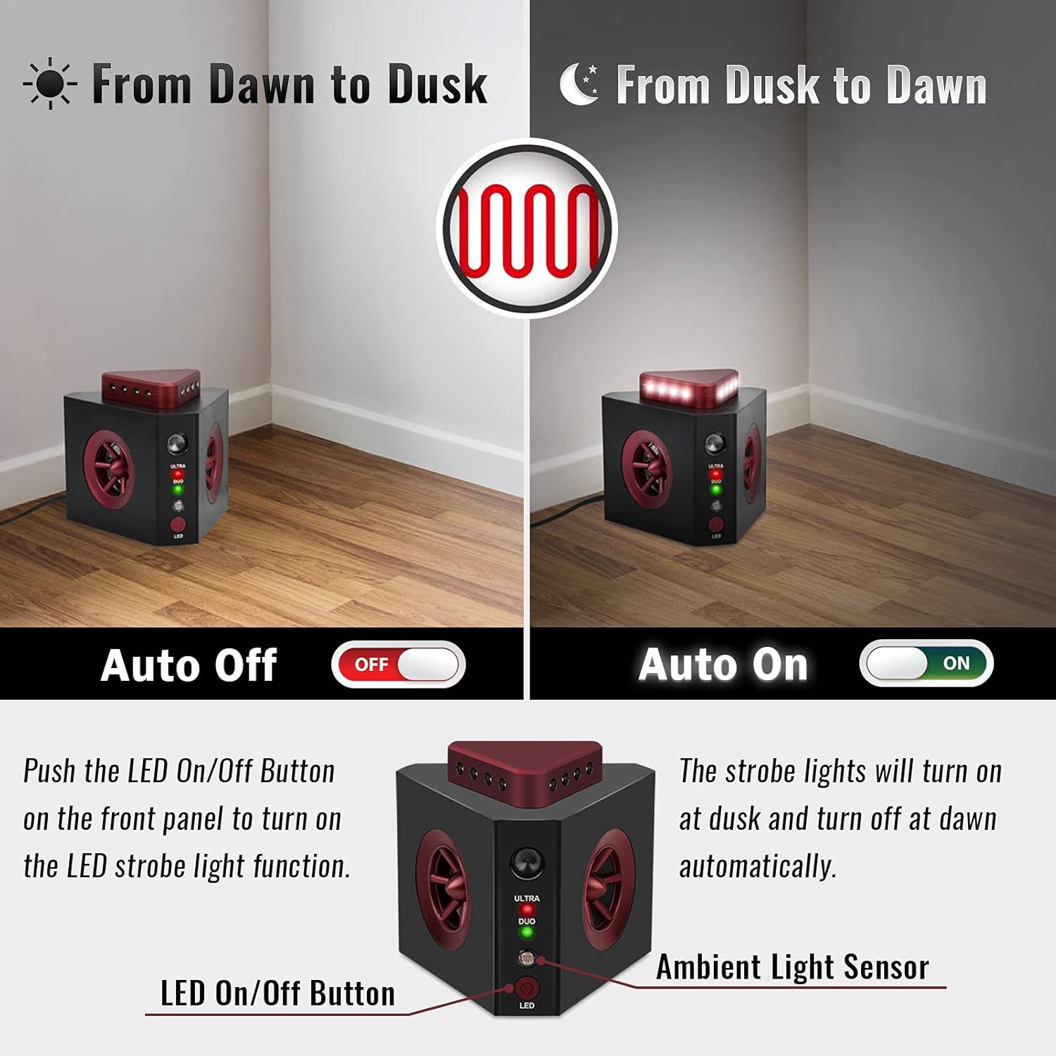 The device features 12 high-intensity LED strobe lights. Press the LED On/Off Button on the front panel to activate or deactivate the strobe light function. When activated, the lights will automatically turn on at dusk and turn off at dawn, thanks to the built-in ambient light sensor.