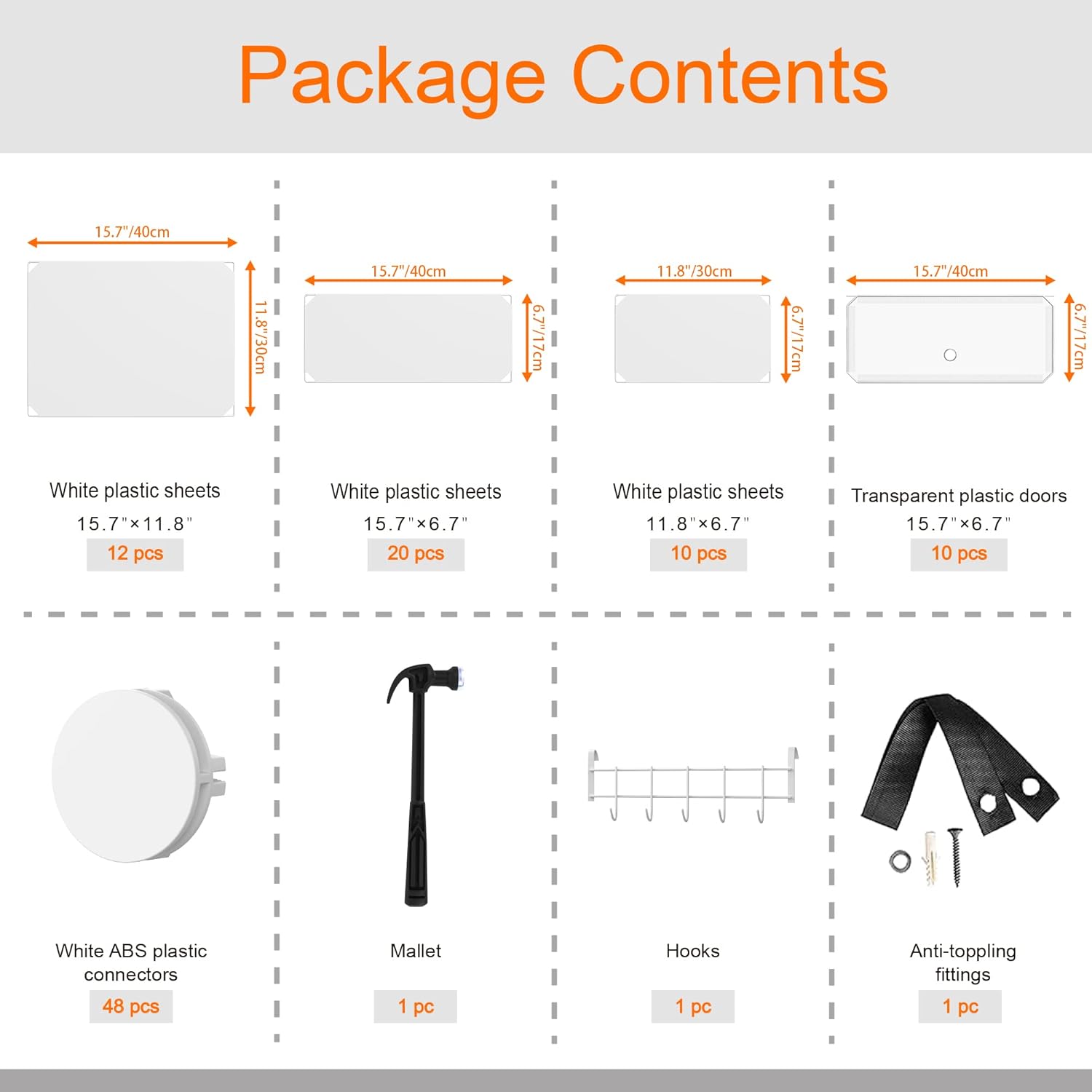 This diagram details all the components provided in the package, including various sizes of plastic sheets, transparent doors, ABS connectors, a mallet, hooks, and anti-toppling fittings, along with their respective quantities.