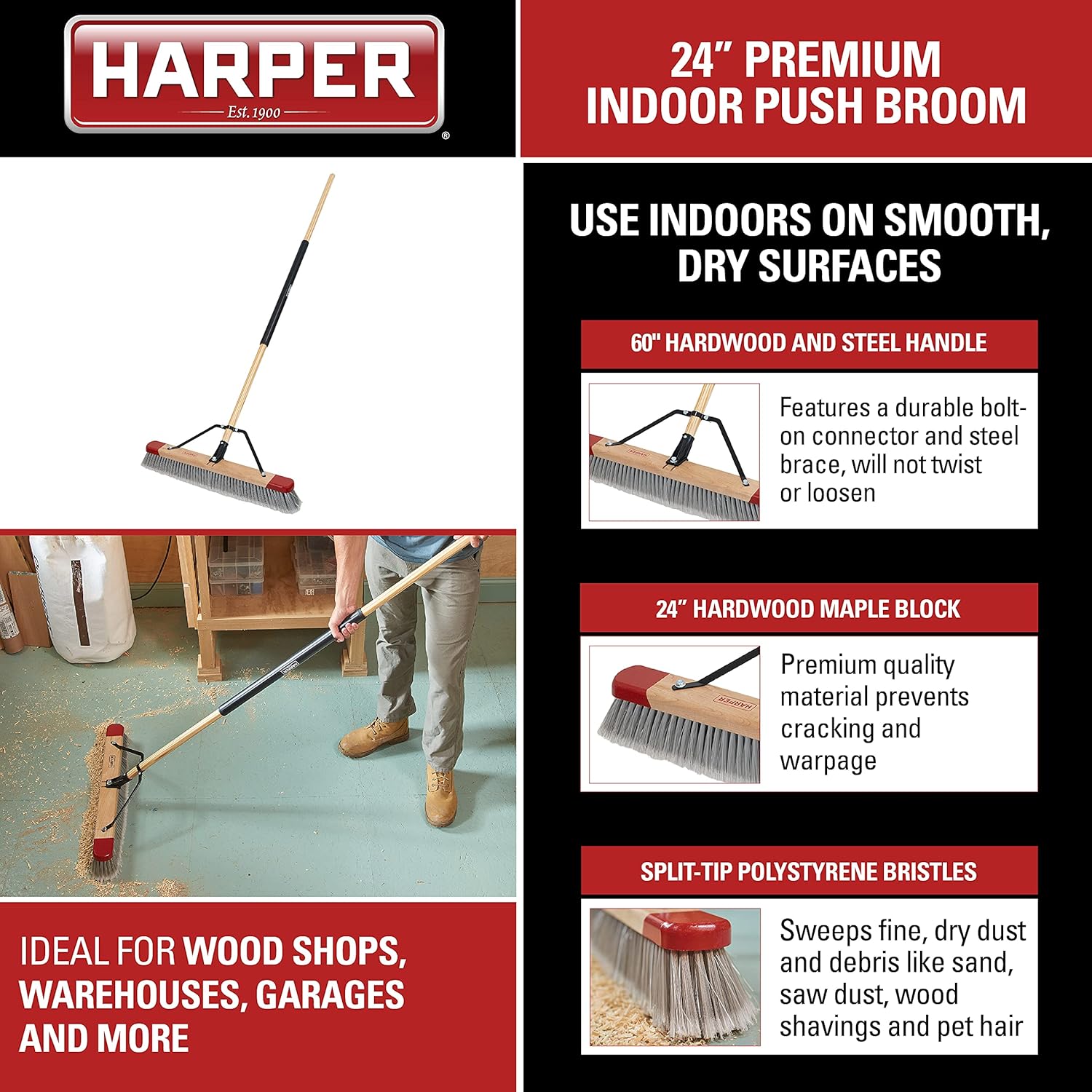 This manual provides essential information for the assembly, operation, maintenance, and care of your Harper 24 Inch Indoor Push Broom. Designed for smooth indoor surfaces, this broom features flagged bristles for effective collection of fine debris. Please read these instructions thoroughly before use to ensure proper function and longevity of your product.