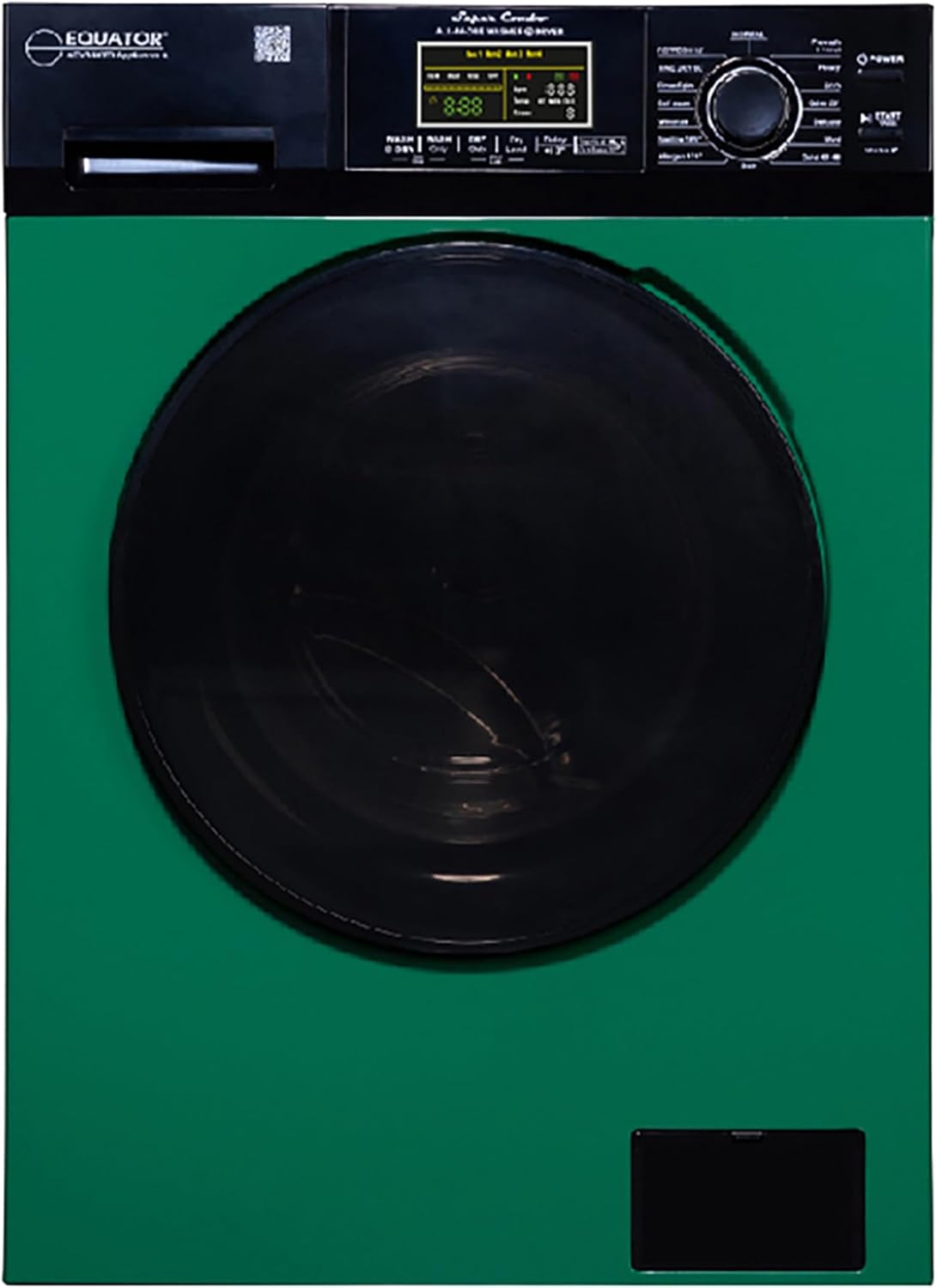 Front view of the Equator Pinnacle 21-5500 Super Combo Washer-Dryer, showcasing its green and black design.