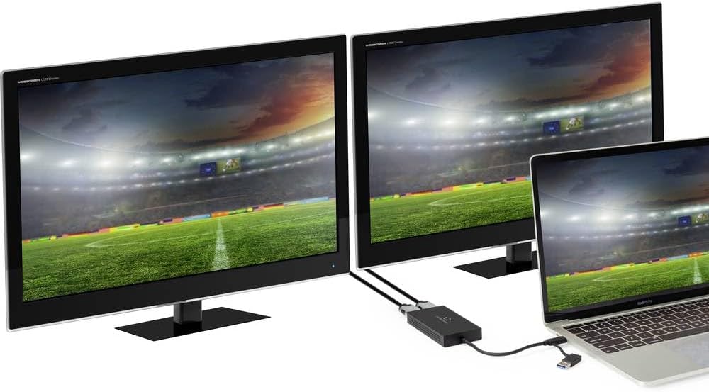The Renkforce External Graphics Card (Model RF-4718832) is designed to expand your computer's display capabilities by adding two HDMI ports via a single USB-A or USB-C connection. This device is ideal for users who need to connect multiple external monitors to their PC or Mac, including MacBook Air models with M2 chips, allowing for extended or mirrored display configurations.