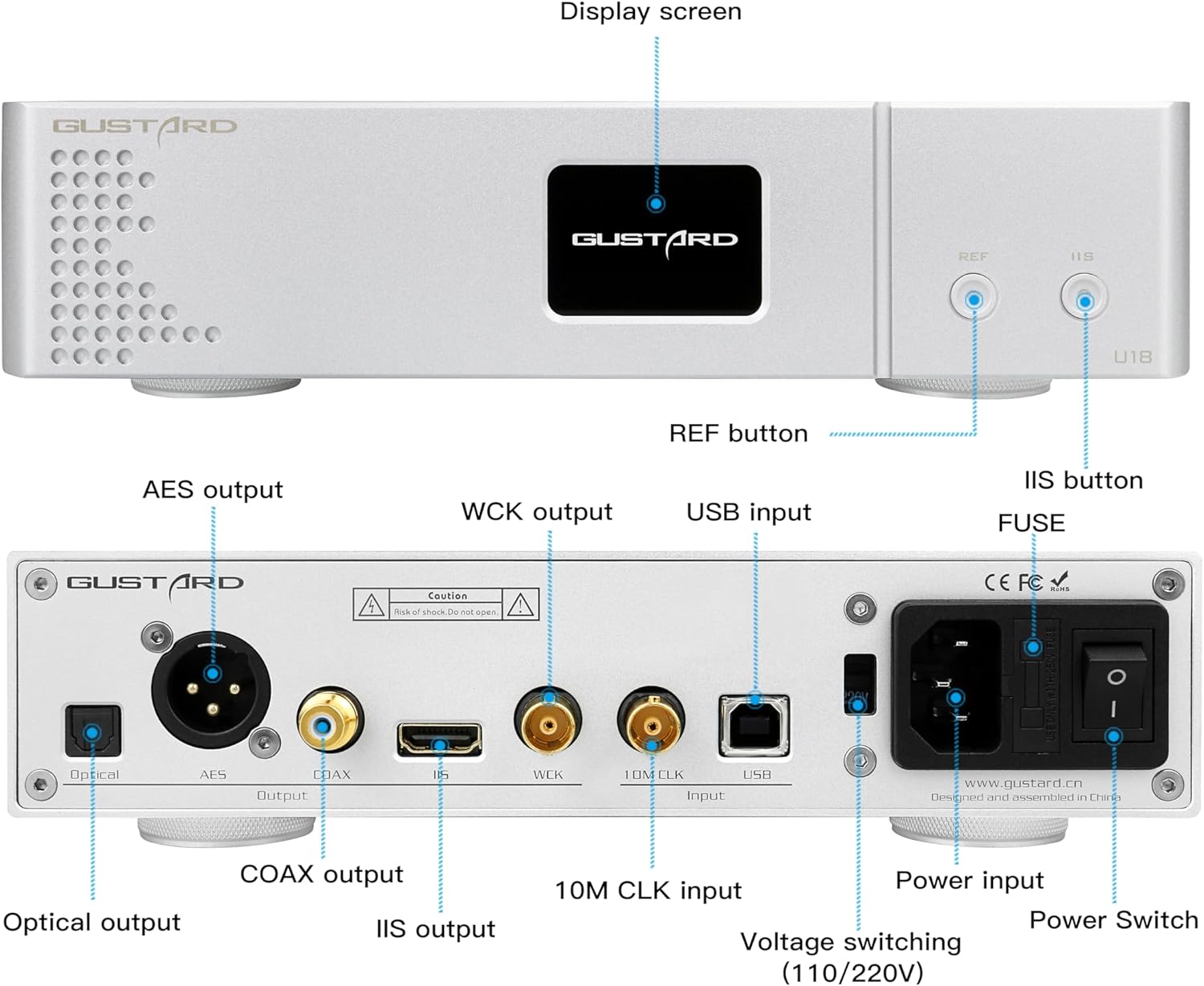 Image: Front and rear panel overview of the Gustard DDC-U18, highlighting key controls and input/output ports.