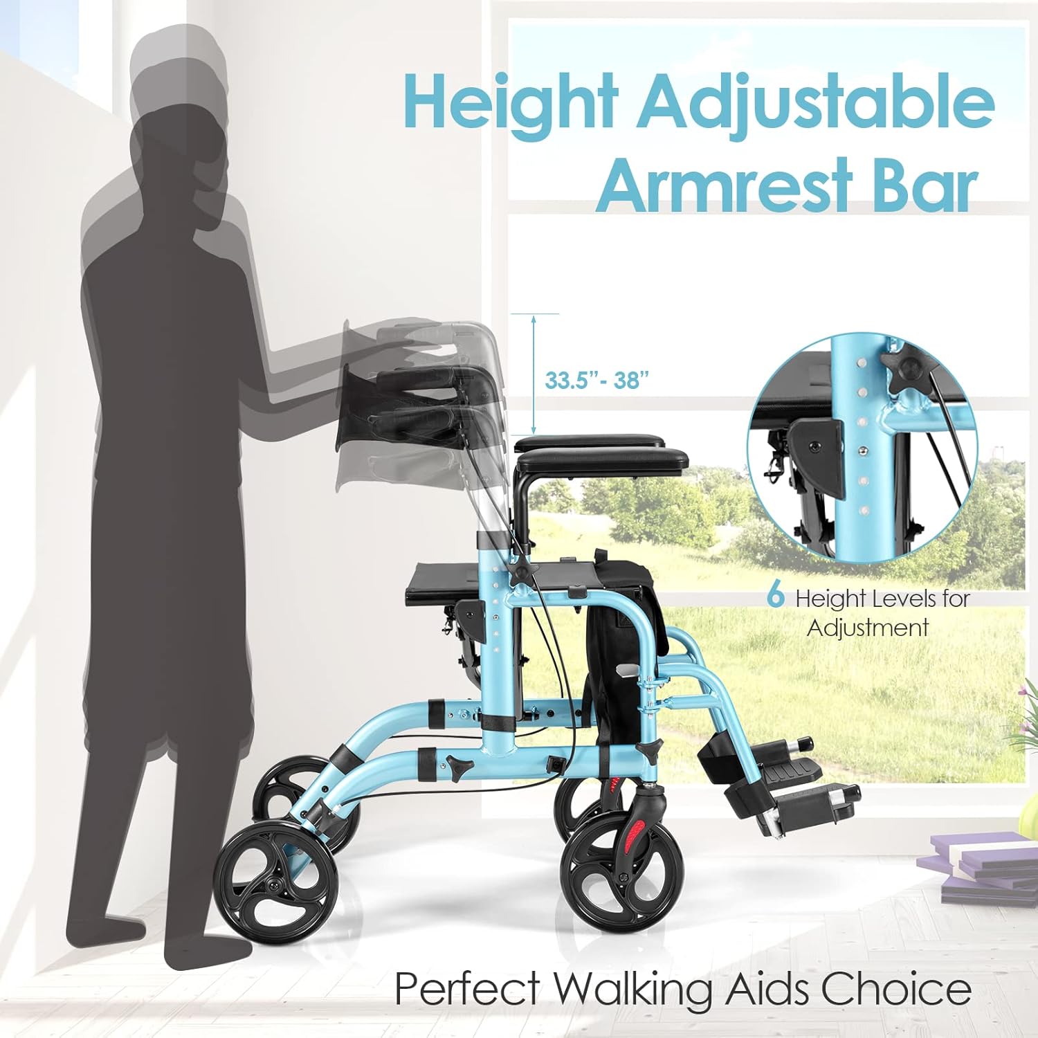 This manual provides essential information for the safe and effective use of your GYMAX 2-in-1 Folding Rollator Walker. This versatile device functions as both a rollator walker and a transport wheelchair, designed to assist with walking, sitting, and mobility. Please read these instructions thoroughly before assembly and use, and retain this manual for future reference.