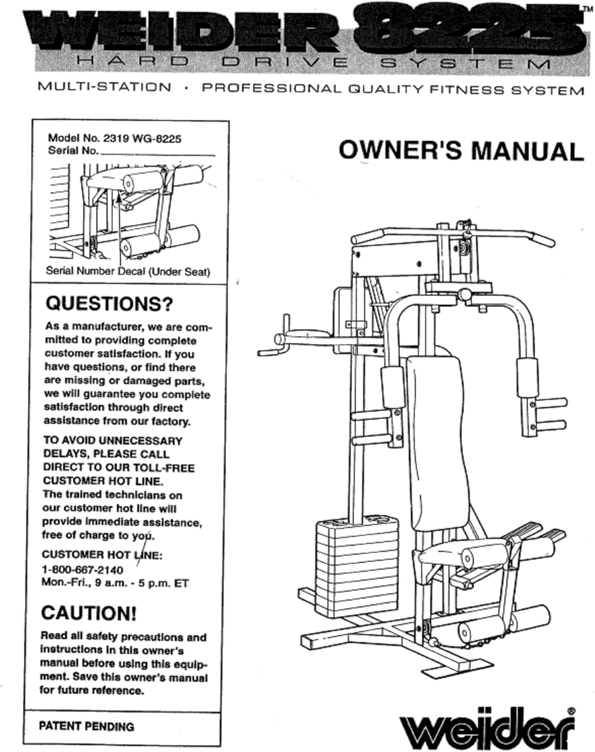 This owner's manual provides essential information for the safe and effective use, assembly, and maintenance of your Weider 8225 Hard Drive Strength System. Please read this manual thoroughly before operating the equipment and retain it for future reference.
