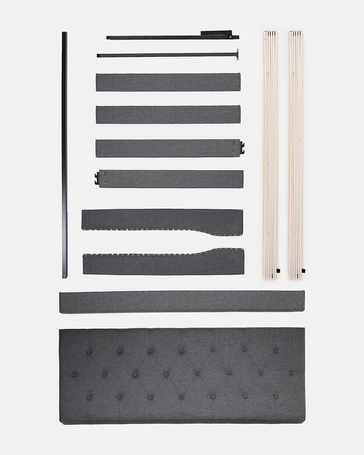 Image description: An overhead view of all bed frame components laid out, including the headboard, side rails, footboard, support legs, and wooden slats.