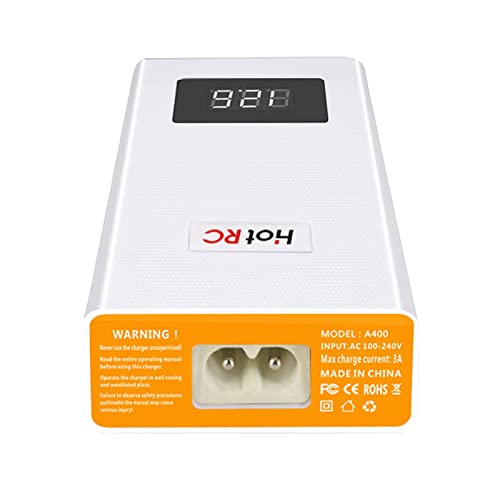 The HOTRC A400 charger features a compact design with a digital LED display for real-time voltage monitoring. It includes dedicated balance ports for 3S and 4S LiPo batteries.