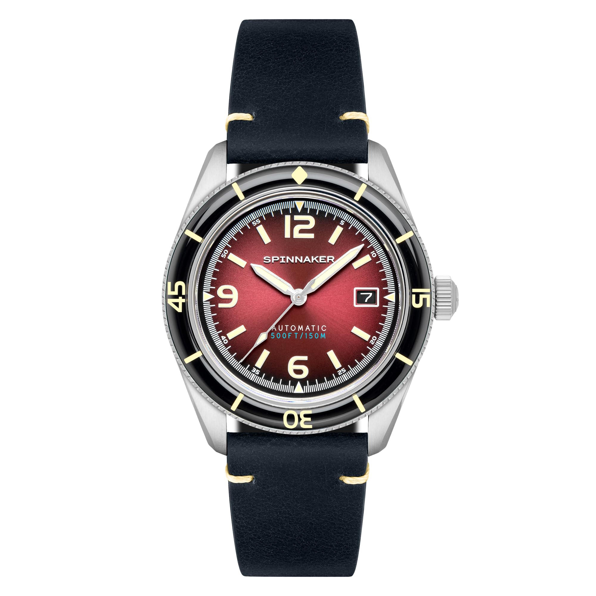 Image: Spinnaker Fleuss SP-5055 automatic dive watch with oxblood red dial and black leather strap on a wrist.
