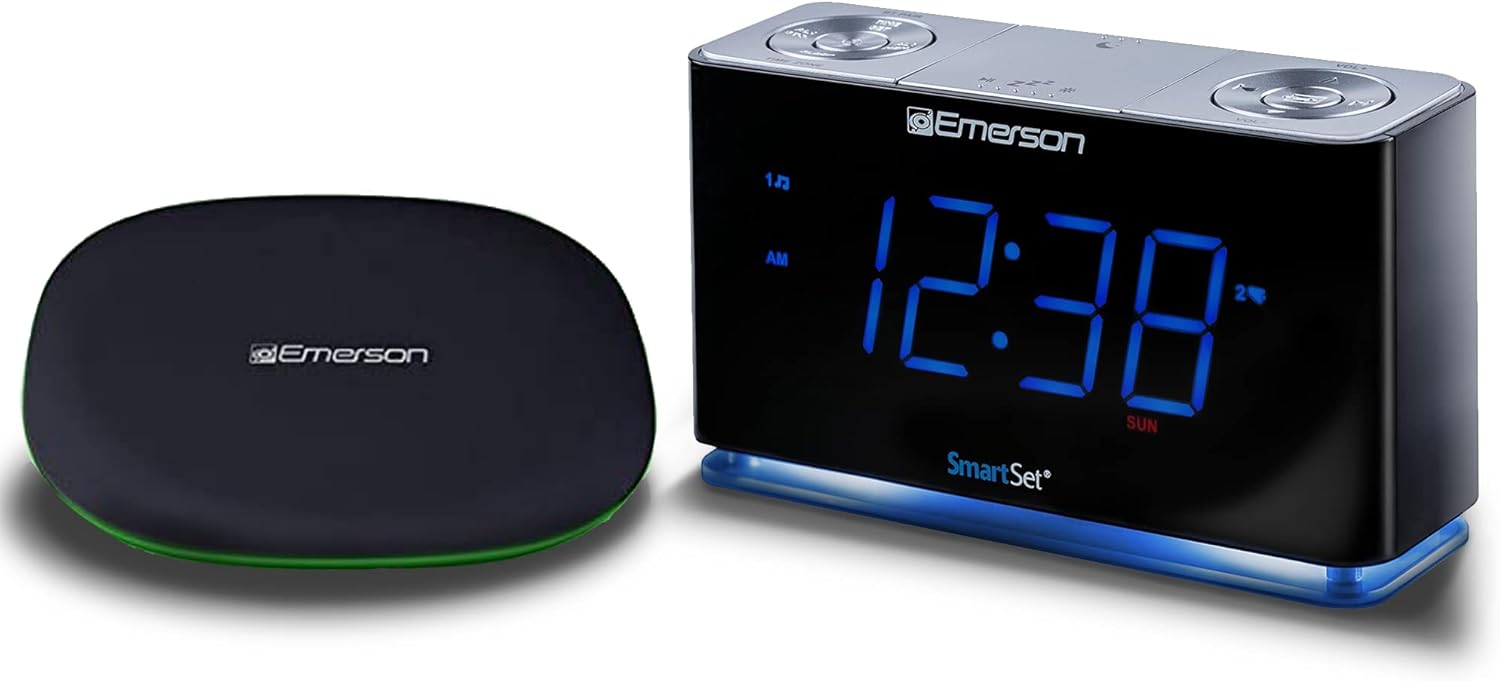 The Emerson SMARTSET PLL Radio Alarm Clock (Model CKS1507WCB) and the Emerson 10W Fast Wireless Charger (Model ER-WC100) are designed to provide convenient timekeeping, audio entertainment, and device charging. The clock radio features Emerson's patented SmartSet technology for automatic time setting, Bluetooth connectivity, FM radio, dual alarms, and a USB charging port. The wireless charger offers fast charging for compatible devices.