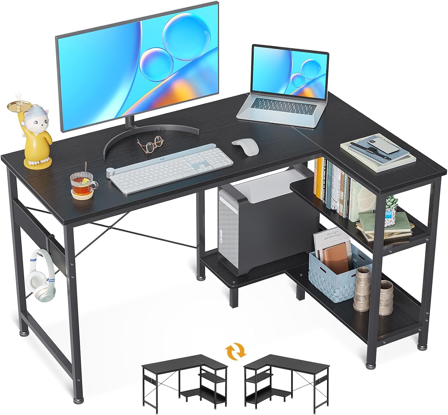 - Install Reversible Shelves: The storage shelves can be installed on either the left or right side of the L-shaped desk to suit your space and preference. Follow the specific instructions for your desired orientation.
