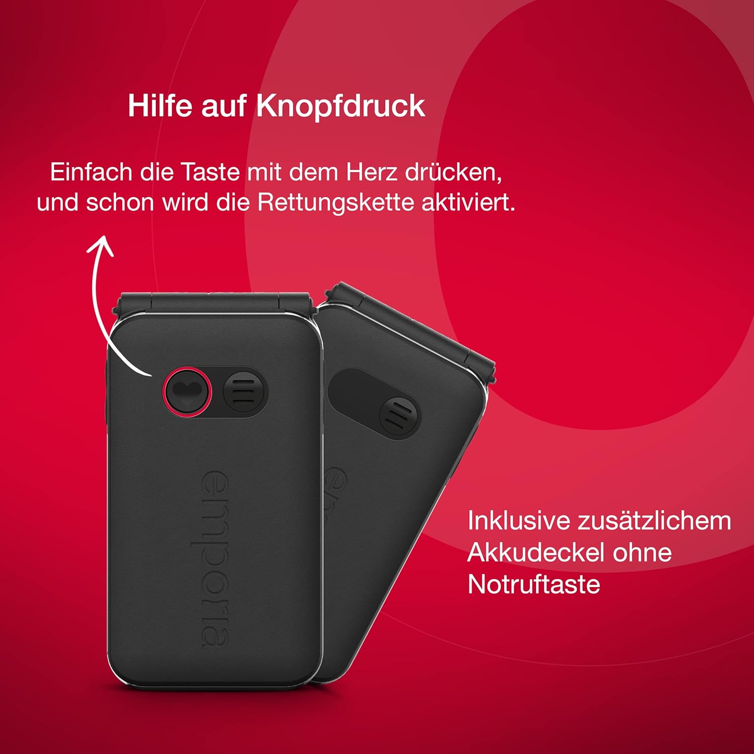 Image: The back of the emporia JOY-LTE phone, illustrating the emergency button and the option to use an alternative battery cover without the button.