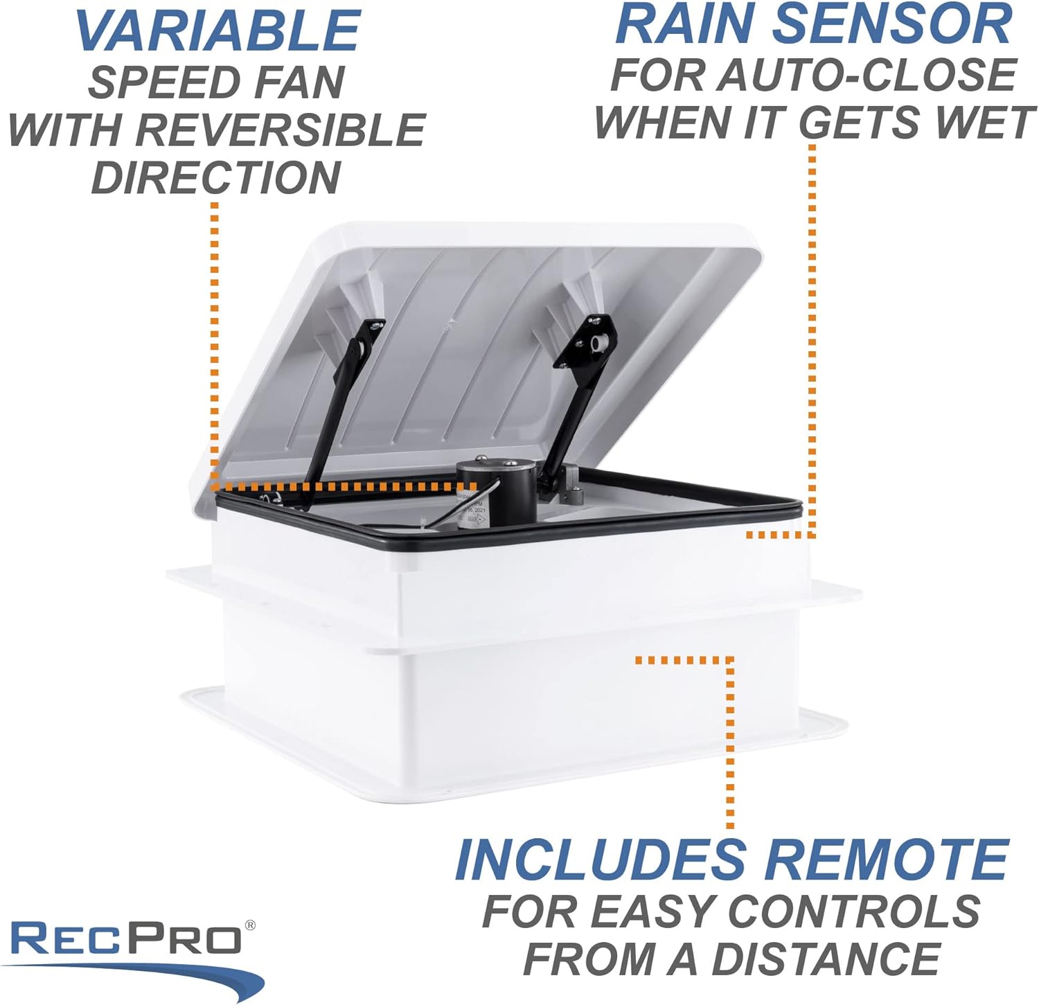 Image: This illustration highlights the key features of the RecPro RV Roof Vent Fan, including its variable speed, integrated rain sensor for automatic closing, and the convenience of remote control operation.