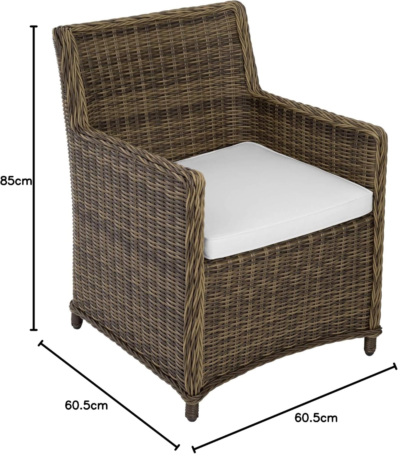 Image 1: tectake Wicker Saint Tropez Garden Chair showing overall dimensions (60.5cm width, 60.5cm depth, 85cm height). This image illustrates the compact and ergonomic design of the chair, highlighting its suitability for various outdoor spaces.
