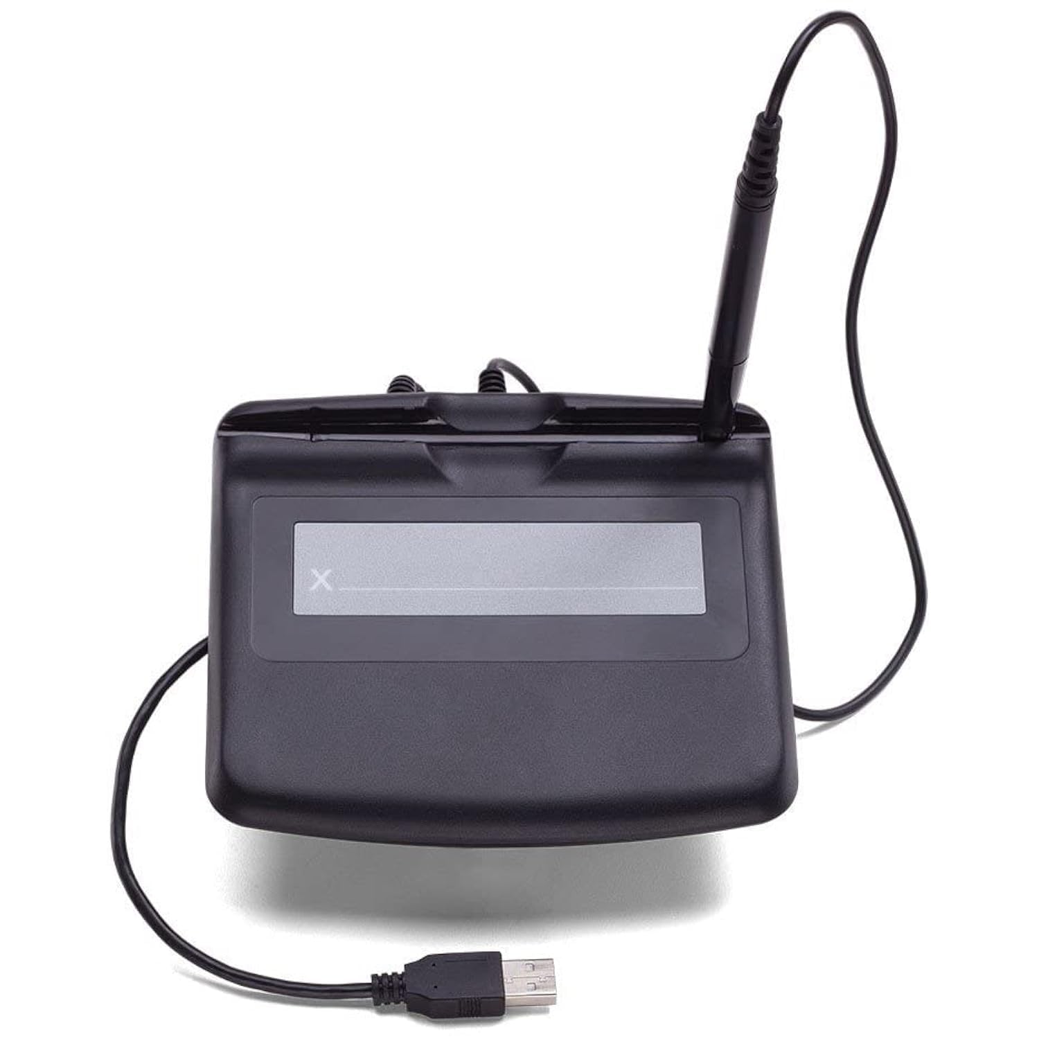 Image: The Scriptel ST1476 signature pad connected to a laptop via its USB cable, ready for use.