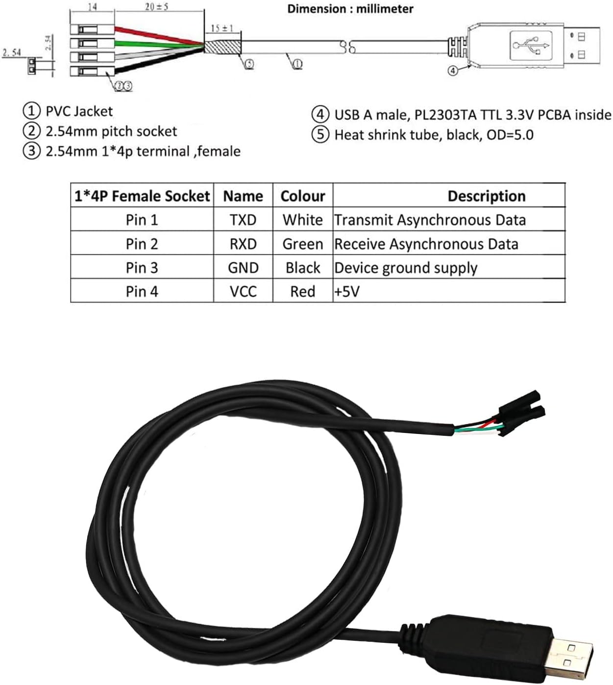 | Pinout | GND (Black), VCC (+5V, Red), TXD (Transmit, White), RXD (Receive, Green) |