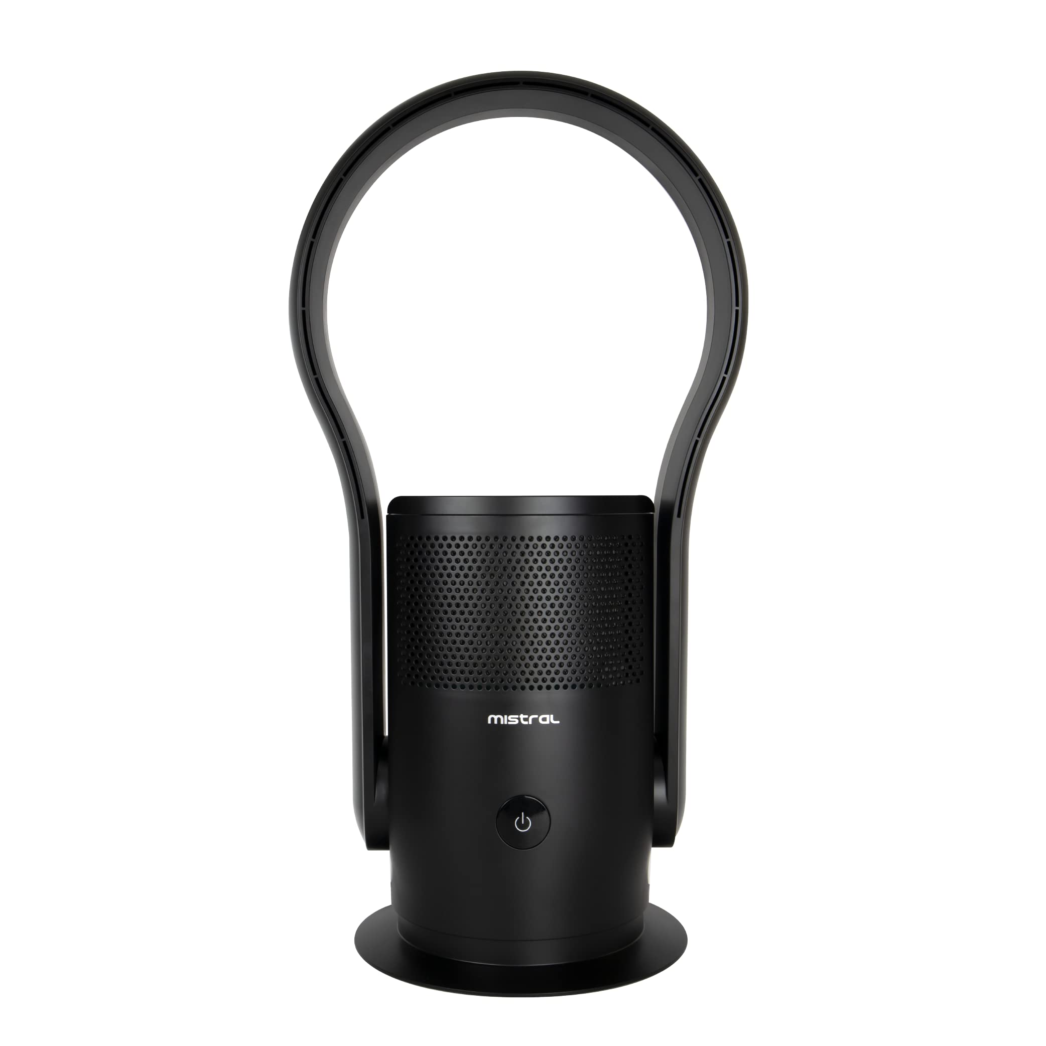 Image: Front view of the MISTRAL Blade Free Fan with Air Purifier MBFAP250, showcasing its sleek, blade-free design and black finish.