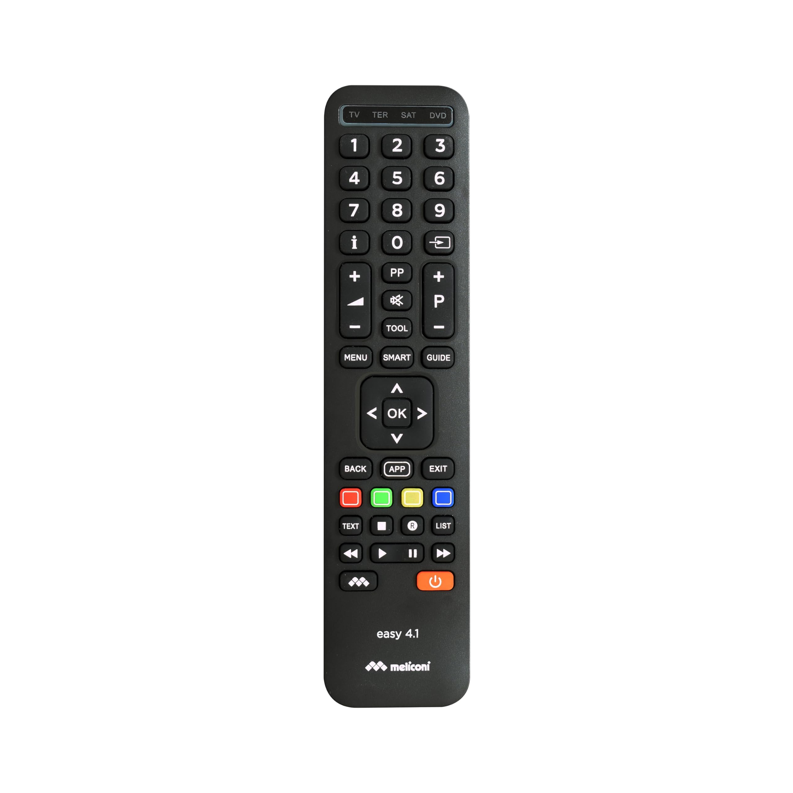 The Meliconi Easy 4.1 features a comprehensive keyboard layout, making it ideal for navigating Smart TV interfaces and applications. Buttons such as APP, SMART, and dedicated colored buttons are designed to interact with modern Smart TV functions. Refer to your TV's manual for specific Smart TV button functionalities.