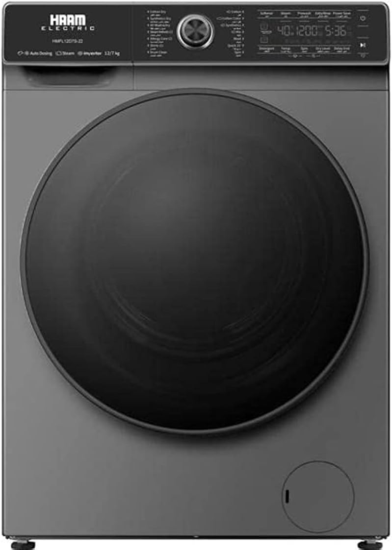 The Haam Electric HMFL12D7S-22 is a front-loading washer and dryer combination unit. Key components include the main control panel, detergent dispenser, and the stainless steel drum.