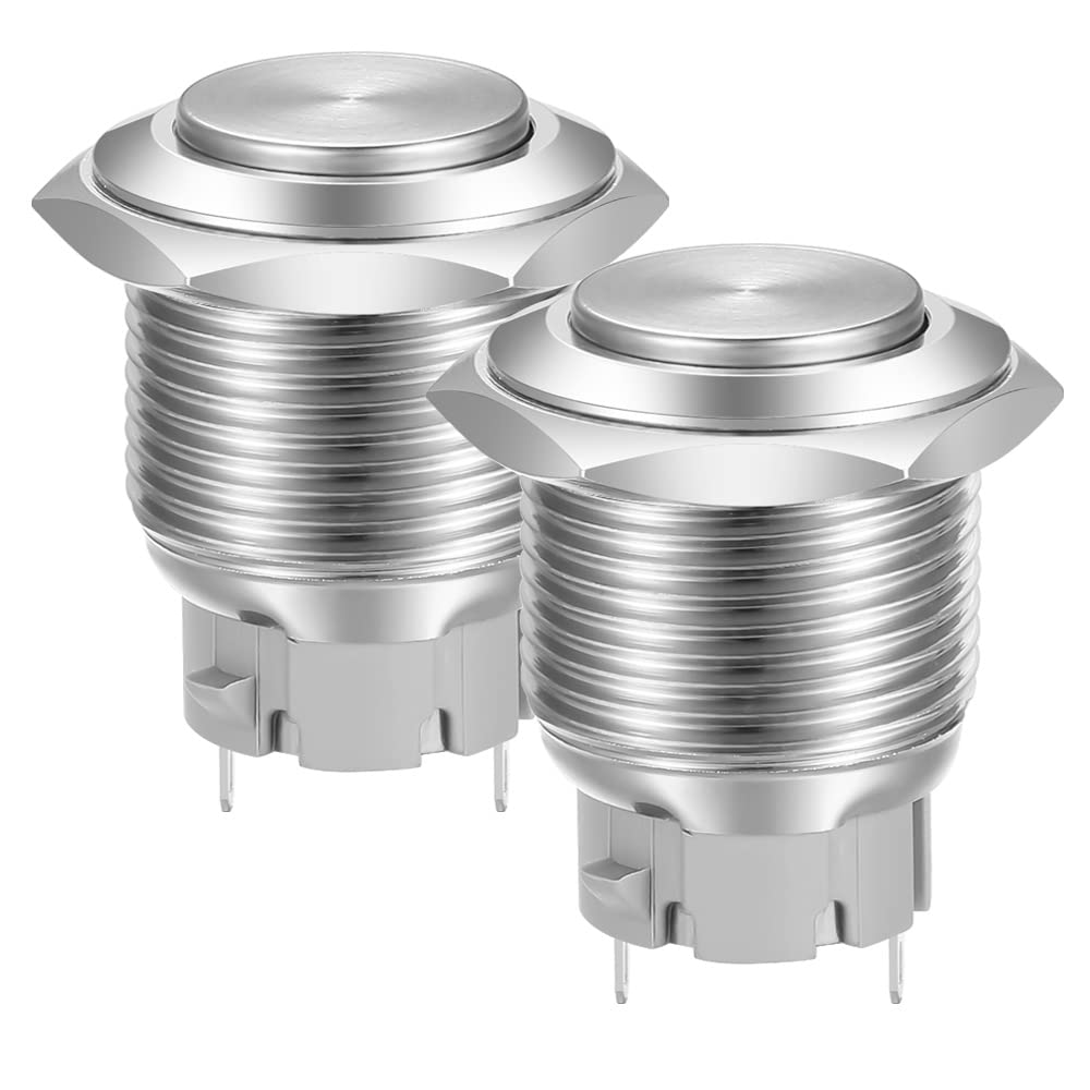 Image 1: Two Gebildet 19mm High Head SPST Latching Push Button Switches. These switches feature a polished metal finish and a high-profile button, ready for installation.