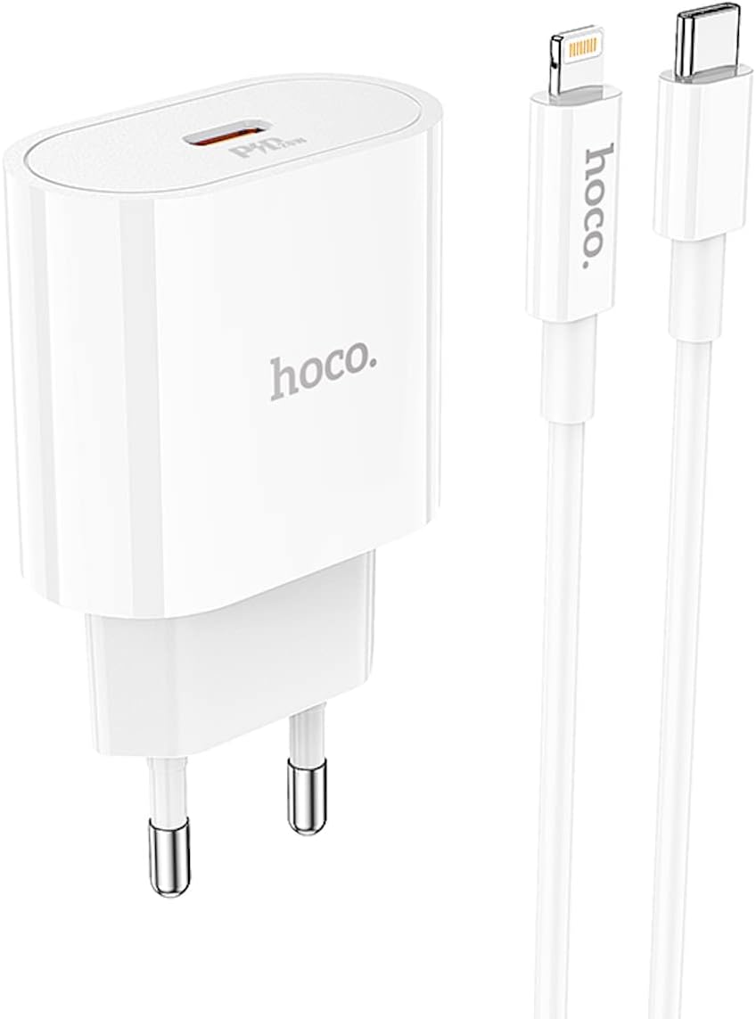 Image 2.1: The HOCO C94A Metro 20W Fast Charger and its accompanying 1-meter Type-C to Lightning cable, shown together.