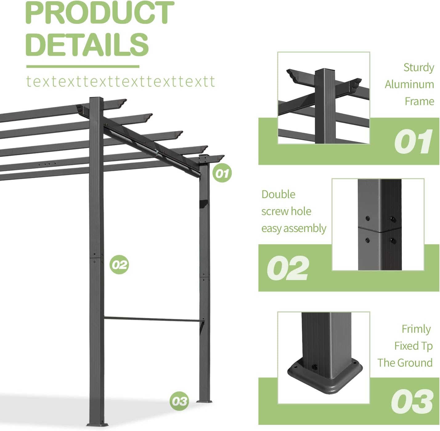 Figure 2.1: Illustration of key product details including the sturdy frame, double screw holes for easy assembly, and the base for ground fixing.
