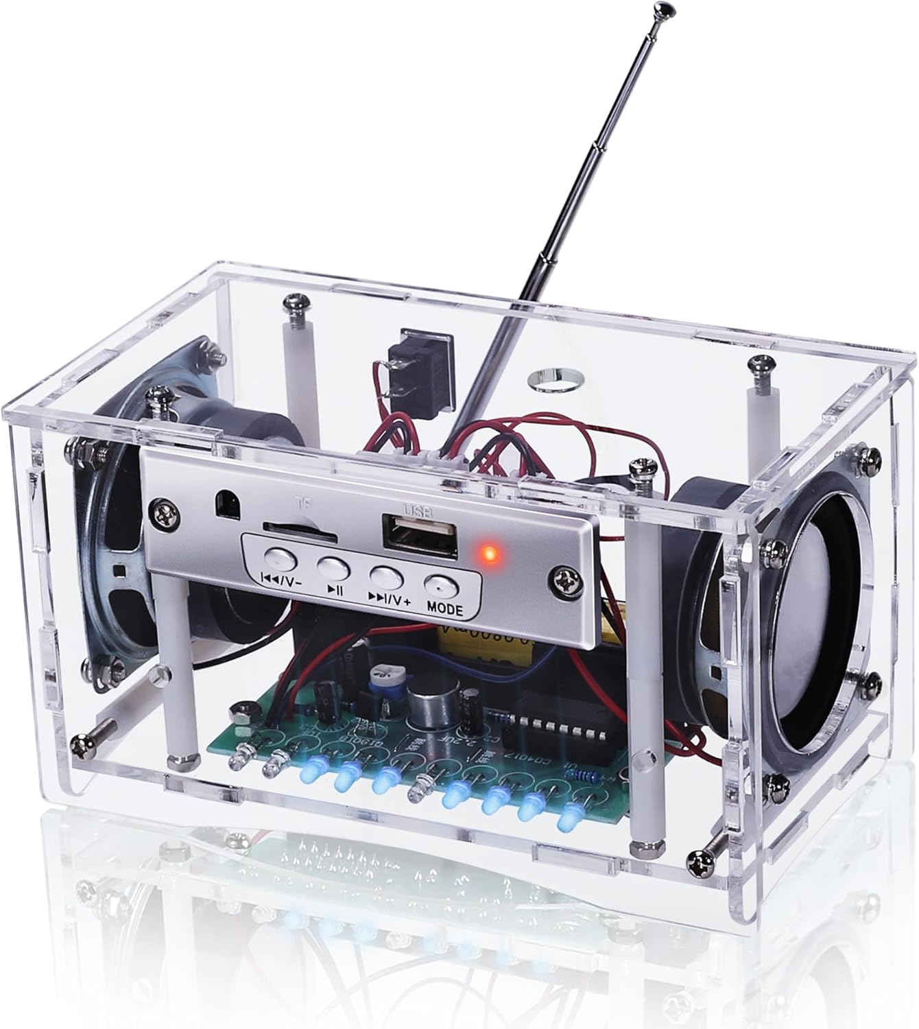 Image: The fully assembled MiOYOOW DIY Bluetooth-Compatible Speaker Kit, showcasing its transparent acrylic casing, internal components, and speakers.
