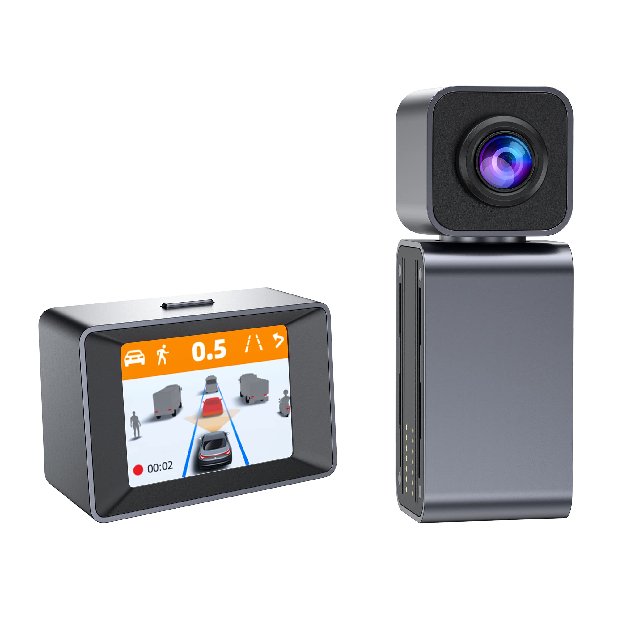 Image: The MINIEYE AC1 Dash Cam showing the main recording unit with its lens and the separate display unit. The display unit shows a simulated traffic scenario with distance warnings, illustrating the ADAS functionality.