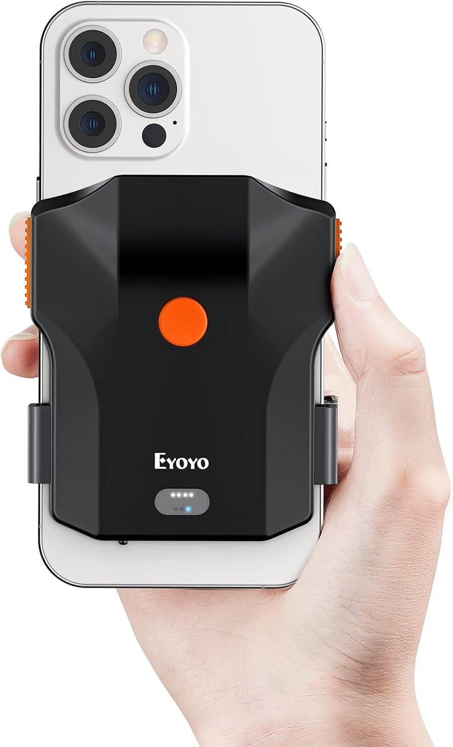 Figure 1: Eyoyo 1D Bluetooth Barcode Scanner attached to a smartphone, demonstrating its compact and portable design.