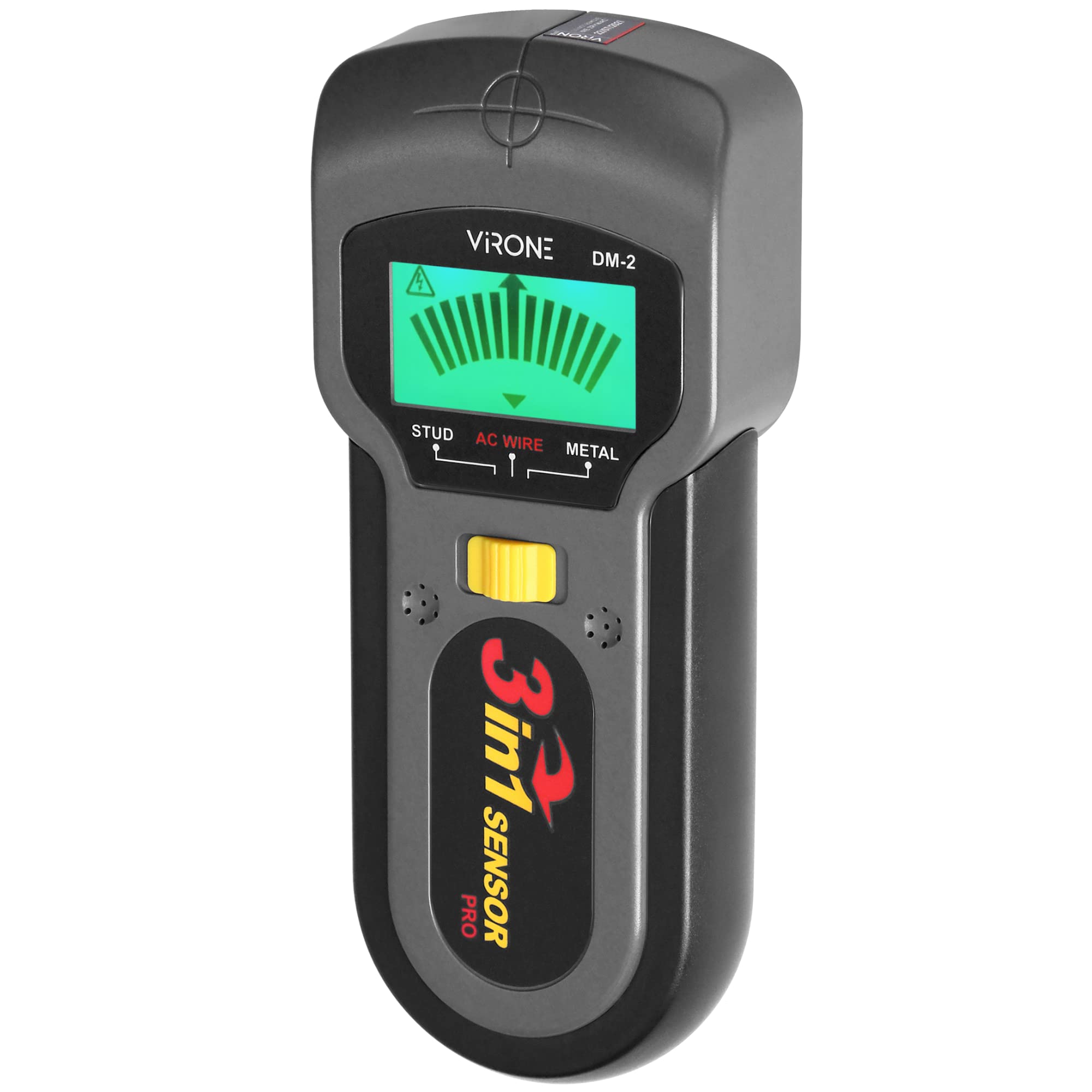 The Virone DM-2 is a versatile 3-in-1 detector designed to accurately locate wood studs, metal objects (such as rebar, pipes, and conduit), and live AC electrical wires hidden behind walls, floors, and ceilings. This device is an essential tool for DIY enthusiasts and professionals, ensuring safety and precision during drilling, cutting, or mounting tasks. Please read this manual thoroughly before using the device to ensure safe and effective operation.