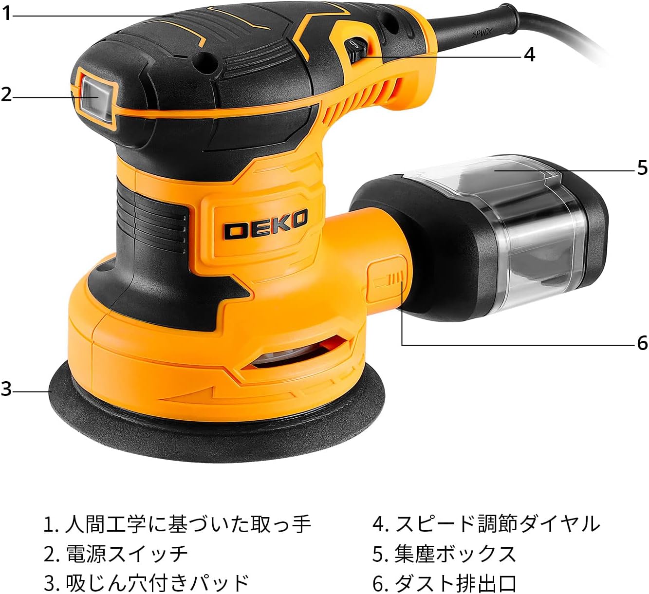 Image: DEKO Random Sander with numbered components. 1. Ergonomic Handle, 2. Power Switch, 3. Sanding Pad with Dust Holes, 4. Speed Adjustment Dial, 5. Dust Collection Box, 6. Dust Exhaust Port.
