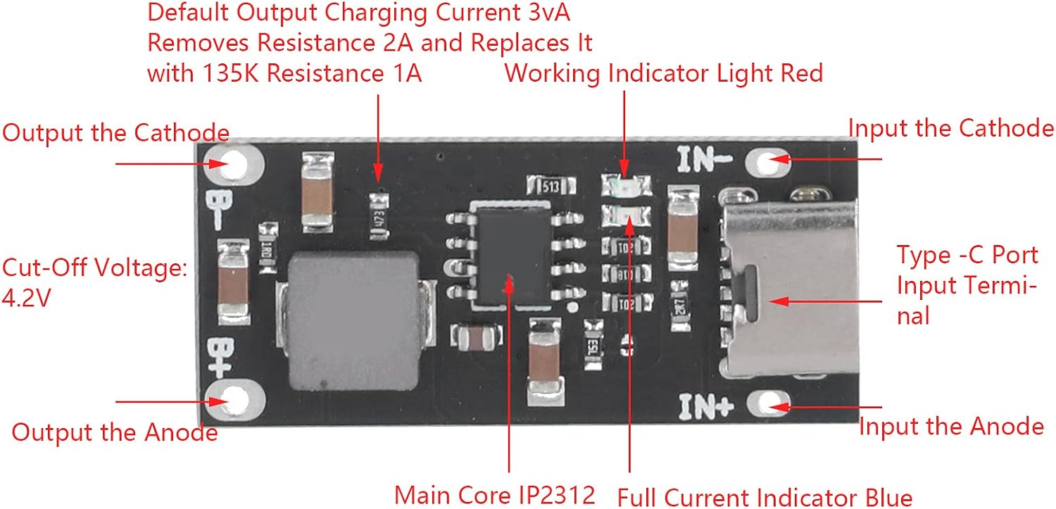 - Current: The default charging current is 3A. Modifying the current requires adjusting the resistance on the board. Exercise caution if attempting this modification.
