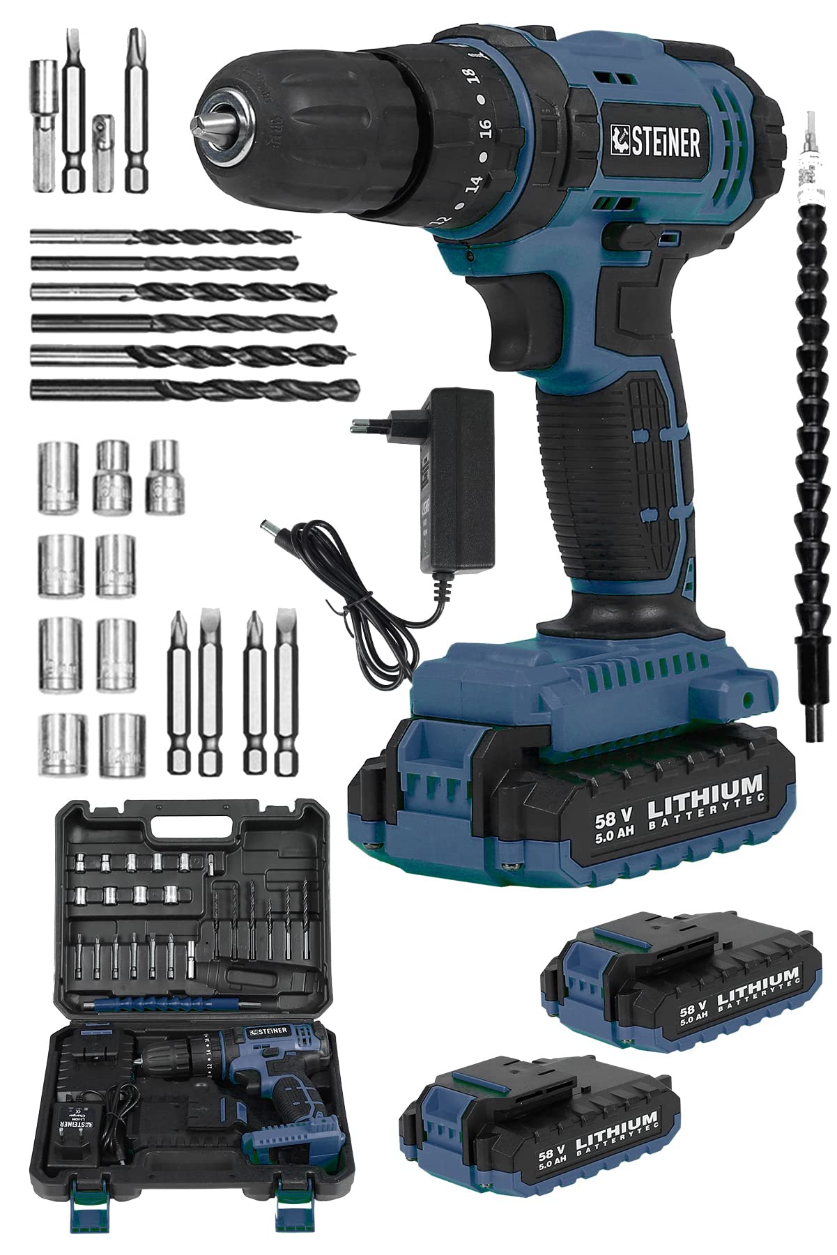 Figure 1: Steiner 58V 5Ah Cordless Impact Drill 24-Piece Set. This image displays the main drill unit, two 58V 5Ah Lithium batteries, a battery charger, a variety of drill bits, screwdriver bits, sockets, and a flexible shaft, all neatly organized within a durable carrying case.