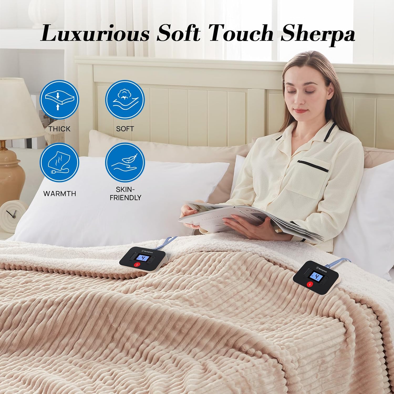 This electric blanket is designed to provide customizable warmth and comfort. It features a reversible design with soft ribbed flannel on one side and thick Sherpa on the other, ensuring comfort even without the heating function activated.