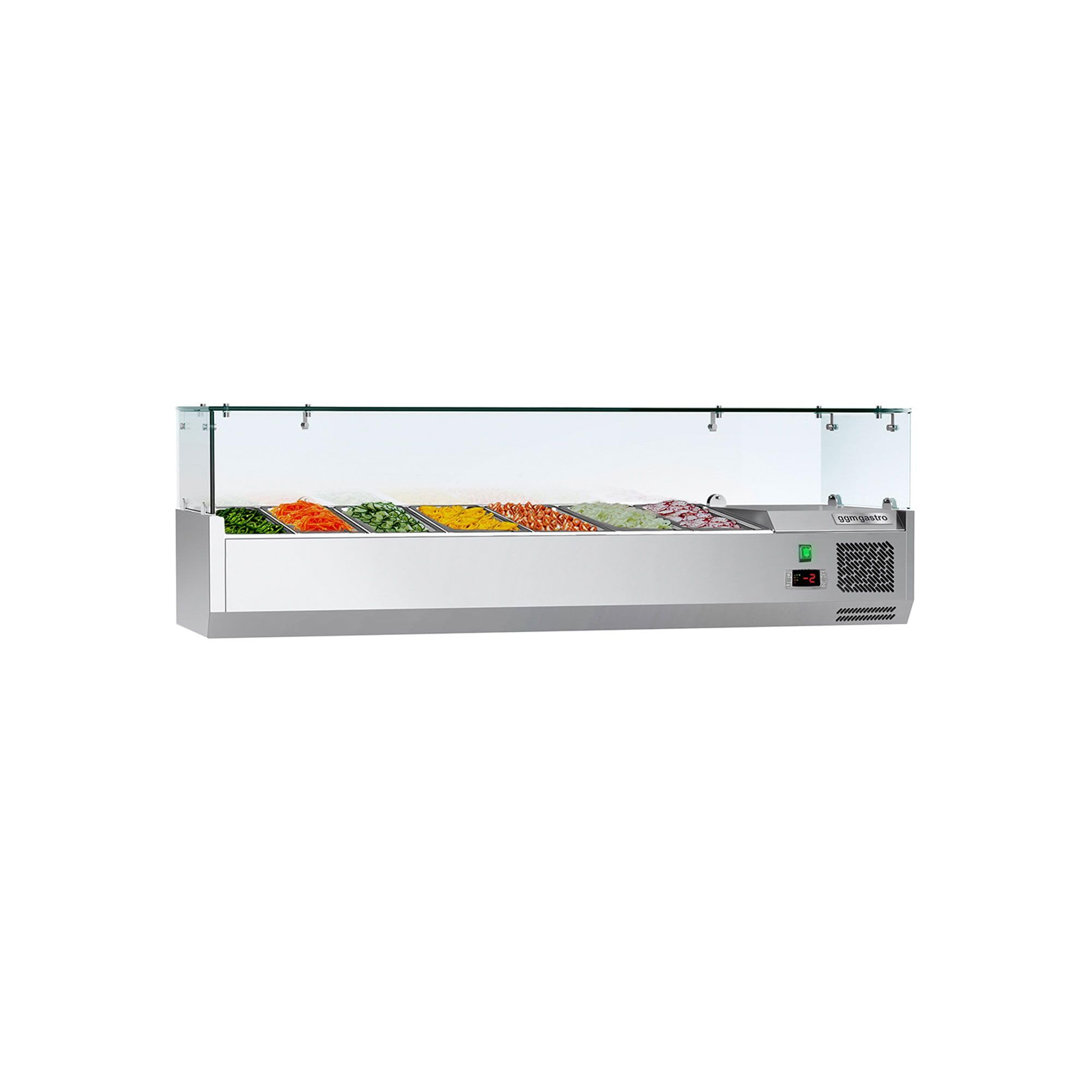 Image: A front view of the GGM Gastro AGG164ND#07 countertop refrigerated display, showcasing its glass cover and multiple GN 1/3 containers filled with various food items like salads and vegetables. This illustrates the unit in typical operational use.