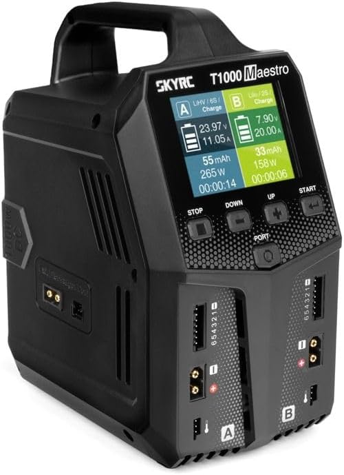 The SkyRC T1000 Maestro Charger features a dual-port design, allowing for simultaneous charging of two batteries. It includes an intuitive LCD display and control buttons for easy navigation and setting adjustments.