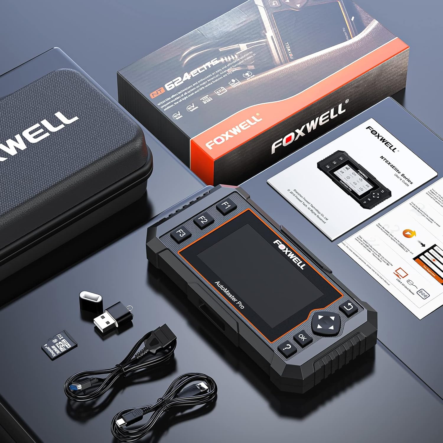 Image: Contents of the FOXWELL NT624 Elite package, showing the diagnostic tool, OBDII cable, USB cable, SD card, and carrying case.