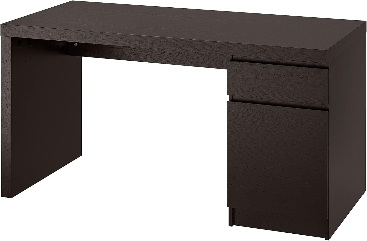 Figure 1: The IKEA MALM Desk in Black-Brown. This image shows the overall design of the desk, featuring a smooth tabletop, a storage unit with drawers, and a finished back panel.