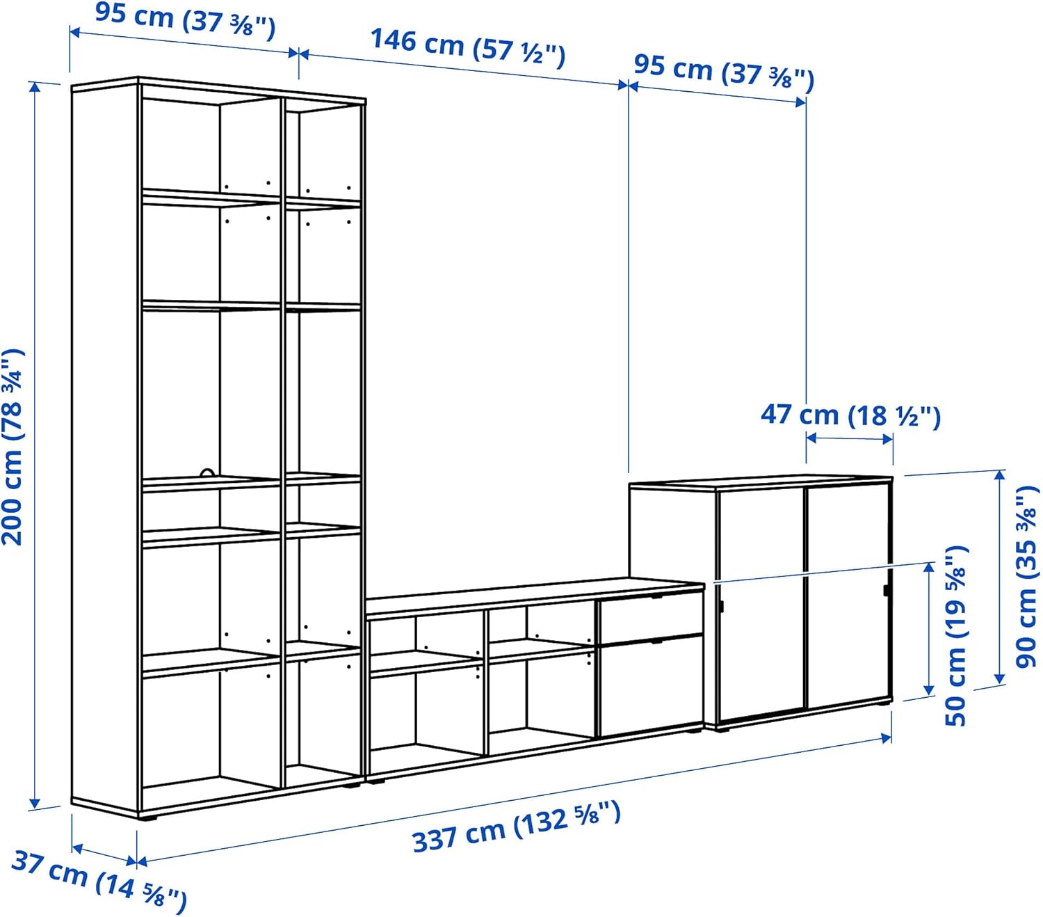 Image: Detailed dimensions of the VIHALS TV/Storage Combination. The overall width is 337 cm (132 5/8"), depth is 47 cm (18 1/2"), and height is 200 cm (78 3/4"). The image illustrates the individual components, including a tall shelving unit, a lower TV bench section, and a cabinet with sliding doors, along with their respective measurements.