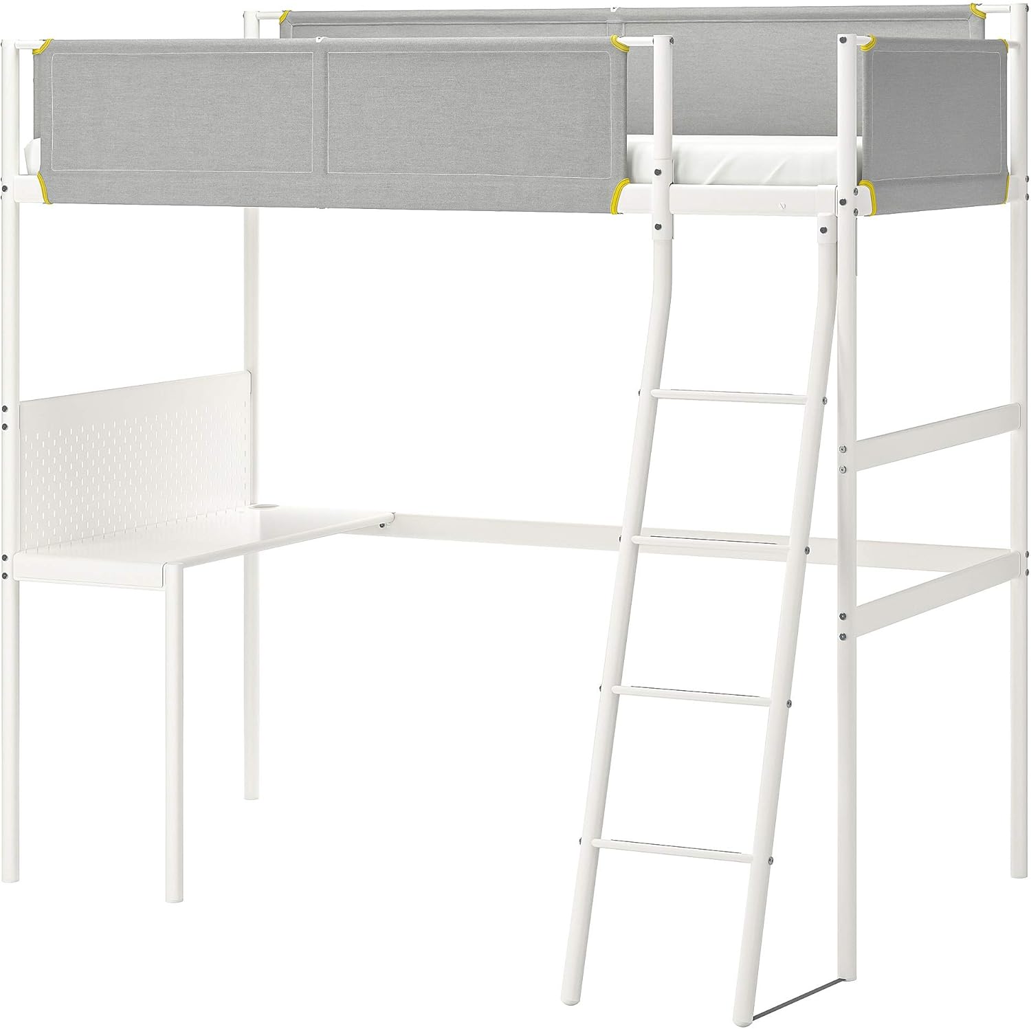 The IKEA VITVAL Loft Bed Frame with Desk Top is designed to maximize space in smaller rooms, offering a comfortable sleeping area elevated above a functional workspace. This model accommodates a 90 x 200 cm mattress and features a white frame with light gray fabric elements.