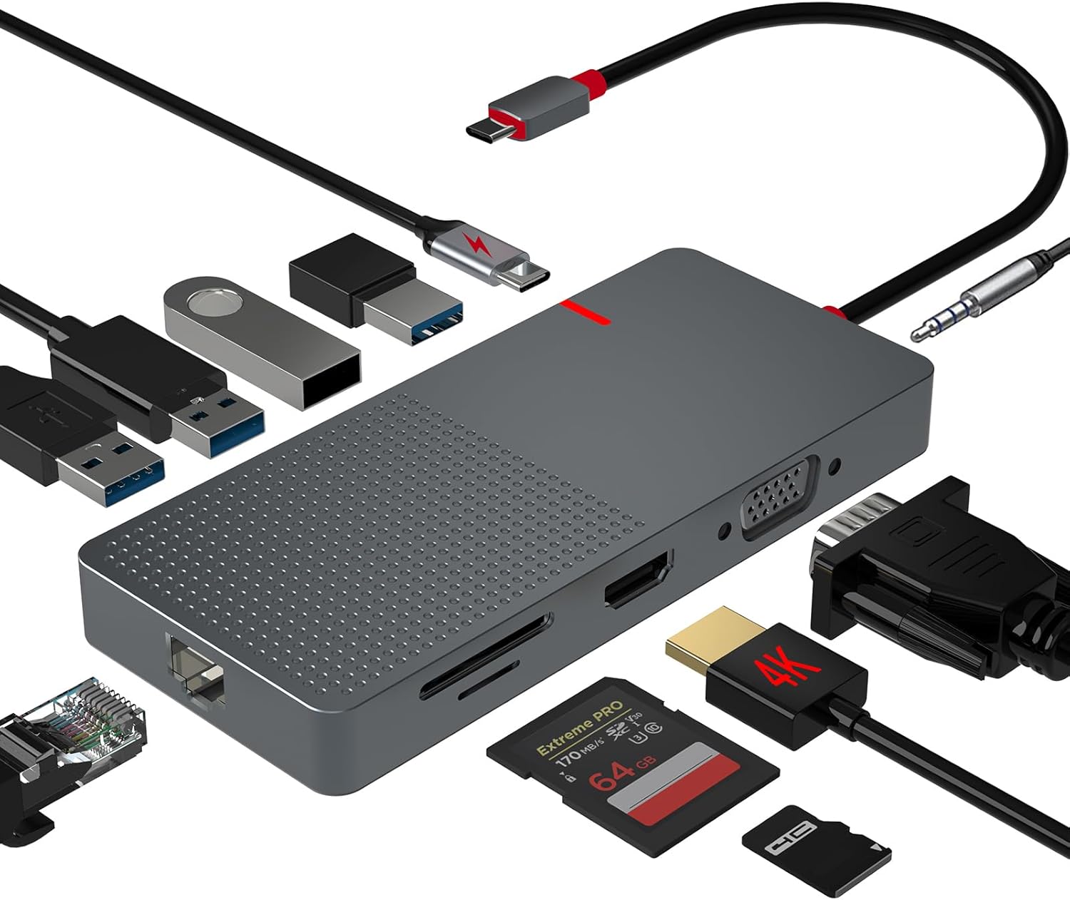 - 11-in-1 Connectivity: Provides 1 HDMI output, 1 USB-C PD fast charging port, 2 USB 3.0 Type-A Ports, 2 USB 2.0 Type-A Ports, 1080p VGA port, 1 Ethernet port (up to 1000Mbps), 1 3.5mm AUX port, and 2 SD/microSD card slots.