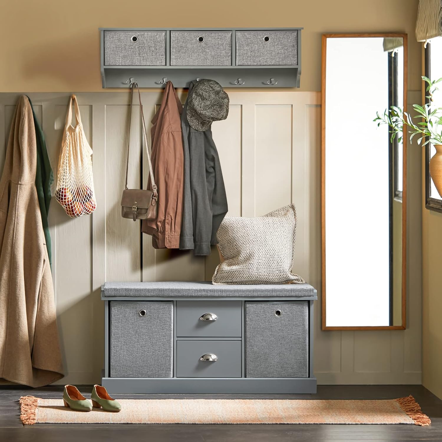 Image 2.1: The assembled SoBuy FSR66-DG storage bench in an entryway, ready for use.