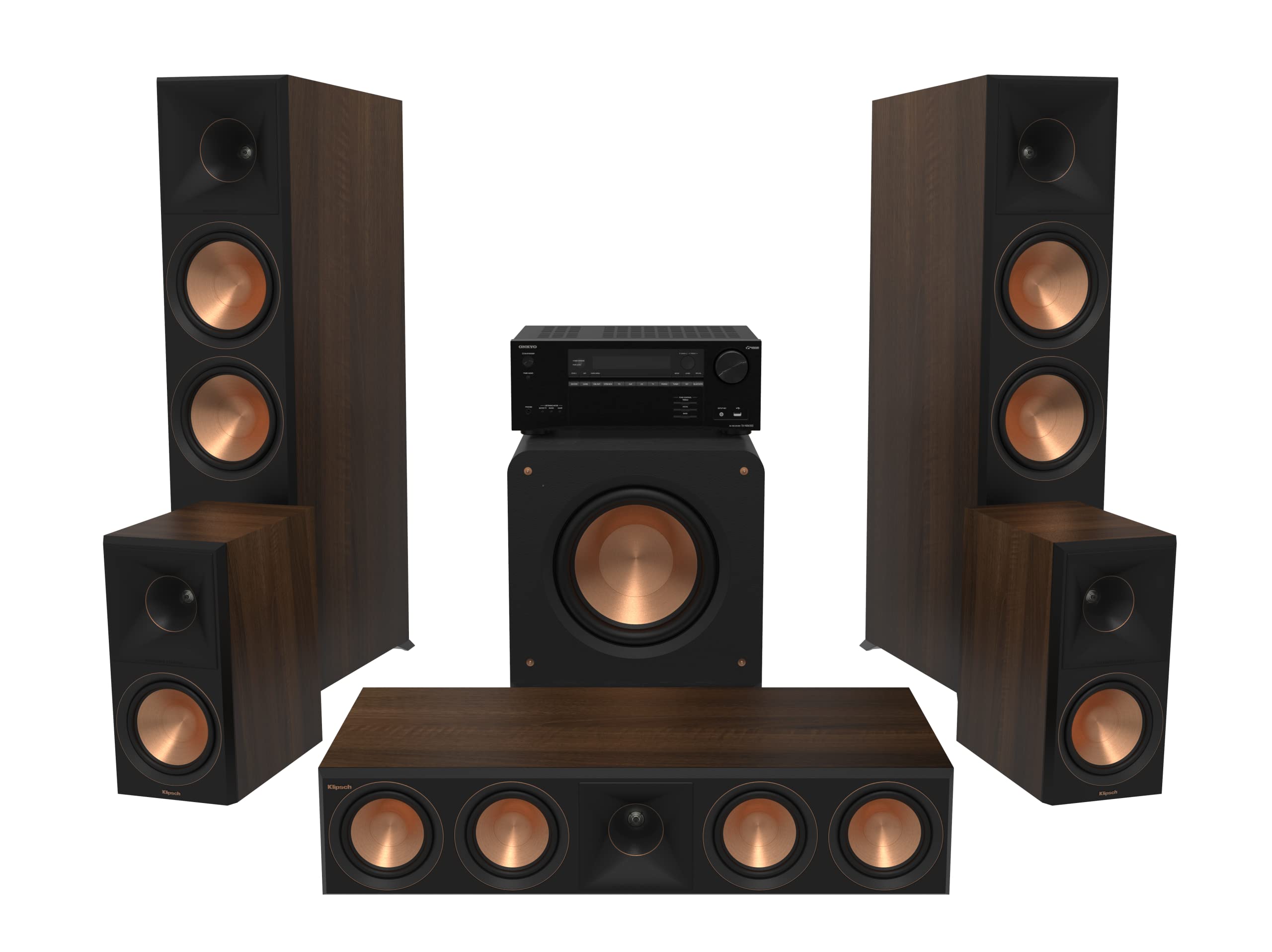 Key specifications for the Klipsch Reference Premiere RP-8060FA II 5.1.2 Home Theater System and Onkyo TX-NR6100 AV Receiver:
