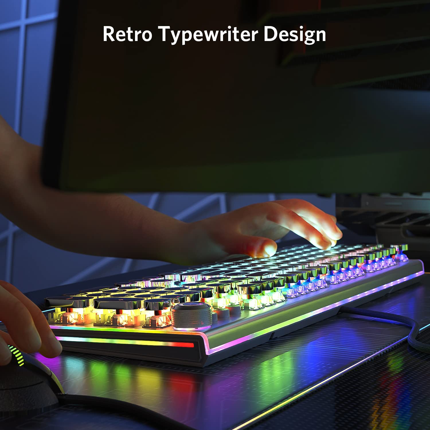 Image: A user typing on the TEWELL T-K82 keyboard, showcasing its retro typewriter design and illuminated keys.