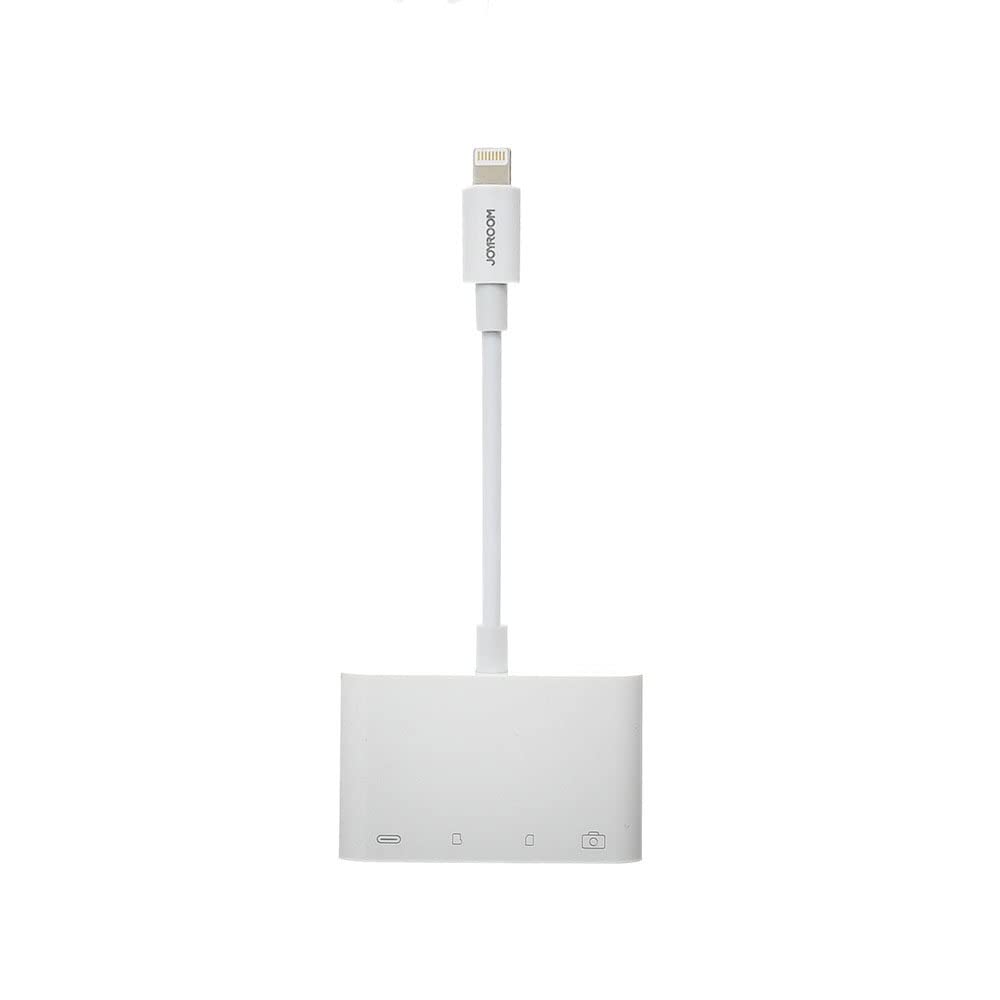 Image 1: Front view of the JOYROOM S-H142 4-in-1 Charger Adapter and Card Reader, showing the Lightning cable, USB port, and card slots.