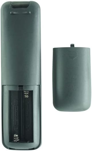 Image: Rear view of the remote control with the battery cover removed, illustrating the correct orientation for AAA battery insertion.